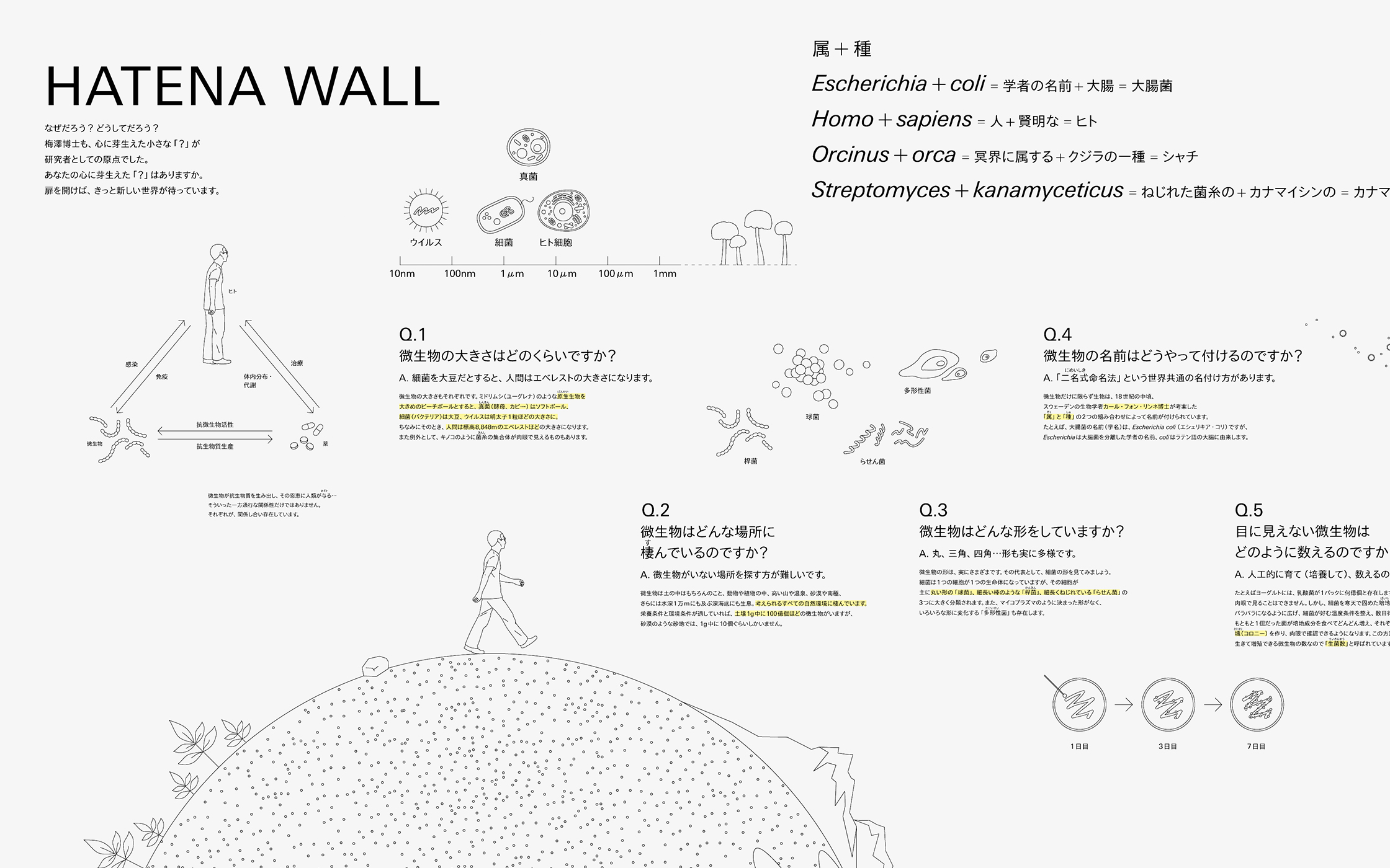 我们为目黑HUM(滨尾梅泽纪念馆)设计了标志、徽标和展品,这个博物馆致力于介绍抗生素研究先驱滨尾梅泽博士的杰出成就。以“将微生物与化学的奇迹带近你身边”为主题,我们构建了一个展示空间,巧妙地运用图形和插图,让您主动深入了解微生物化学的魅力和历史。
