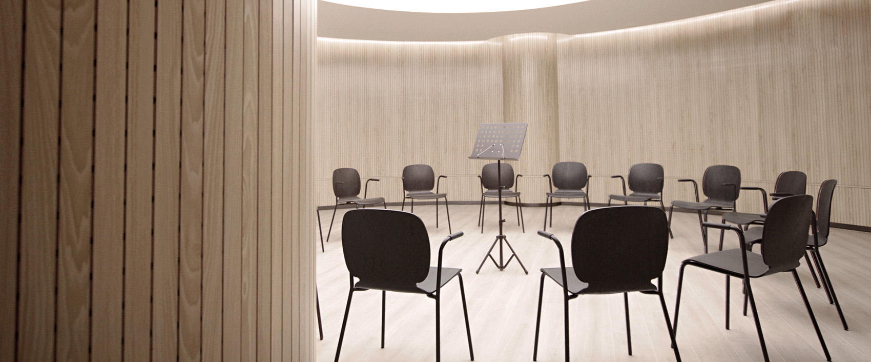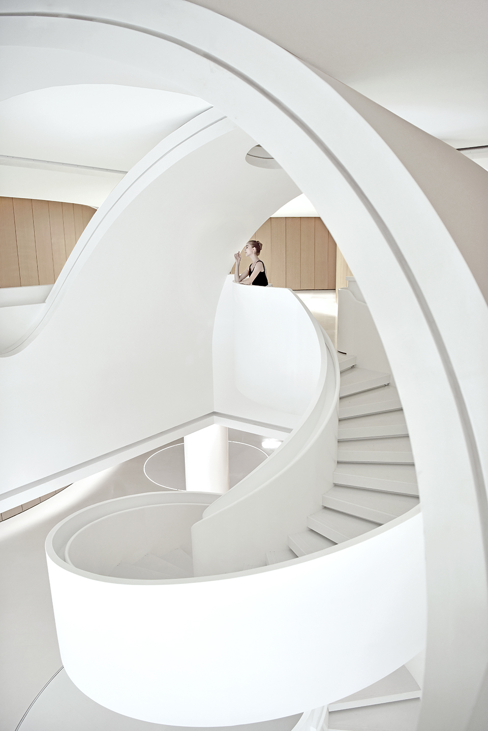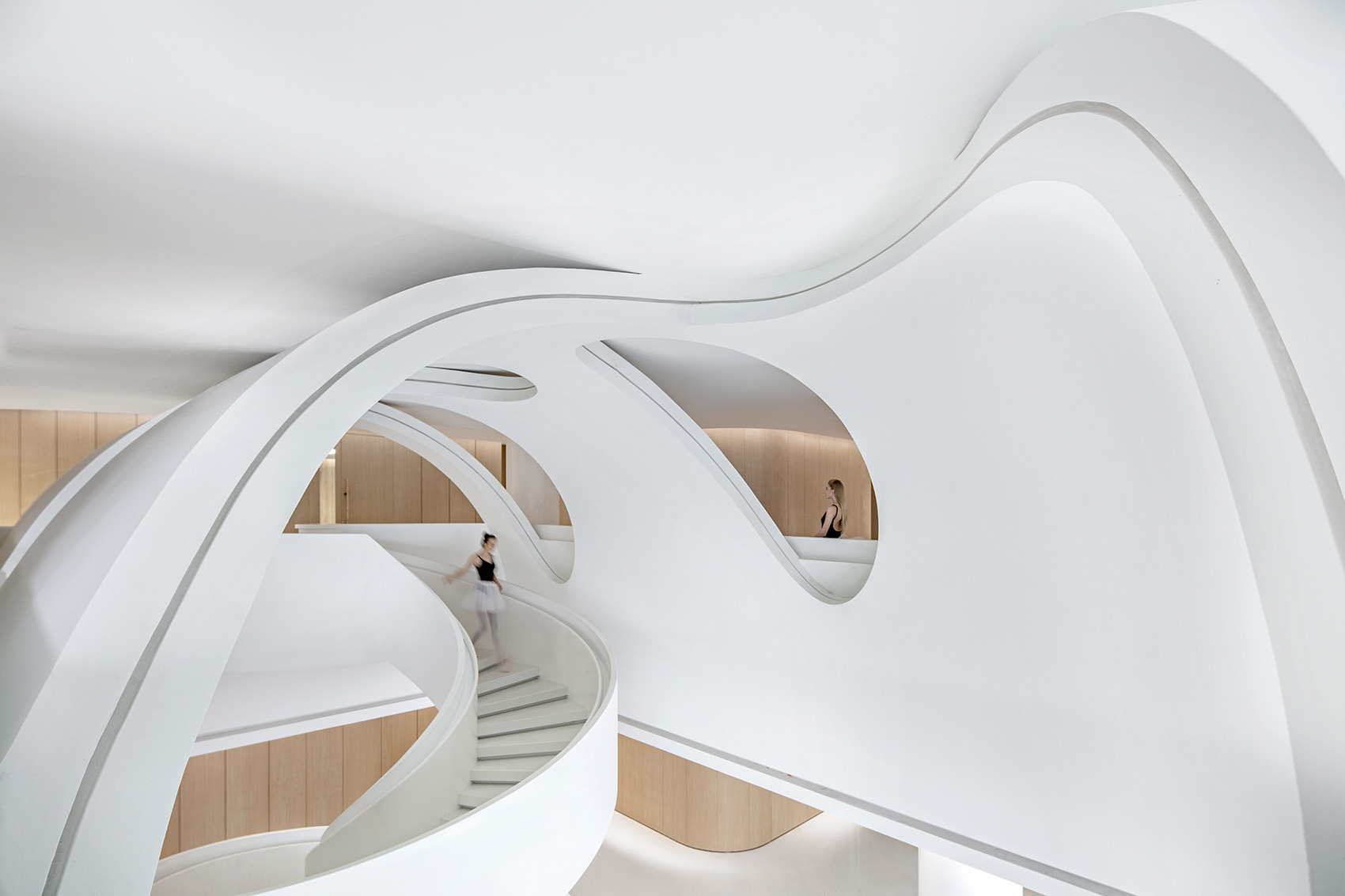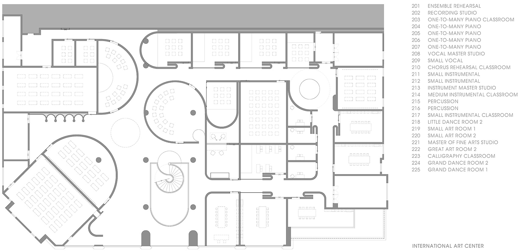 根据功能需要,我们对声量分贝进行了调整,并递进地安排了课室团组。在首层,入口左侧是小剧场,它独立分布,既有独立方位,又有散场人流的空间。中间是舞蹈课室团组,而最深入内部则是安静的小课室团组。