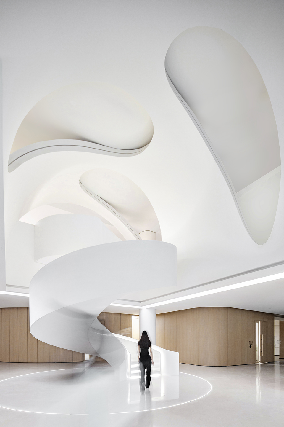 At the entrance of the 8-meter high space, we create a ceremonial experience that makes people feel as if they have stepped into a sacred teaching space when entering the art center. This space is known for its tranquil qualities, and under the illumination of light, it touches every soul.