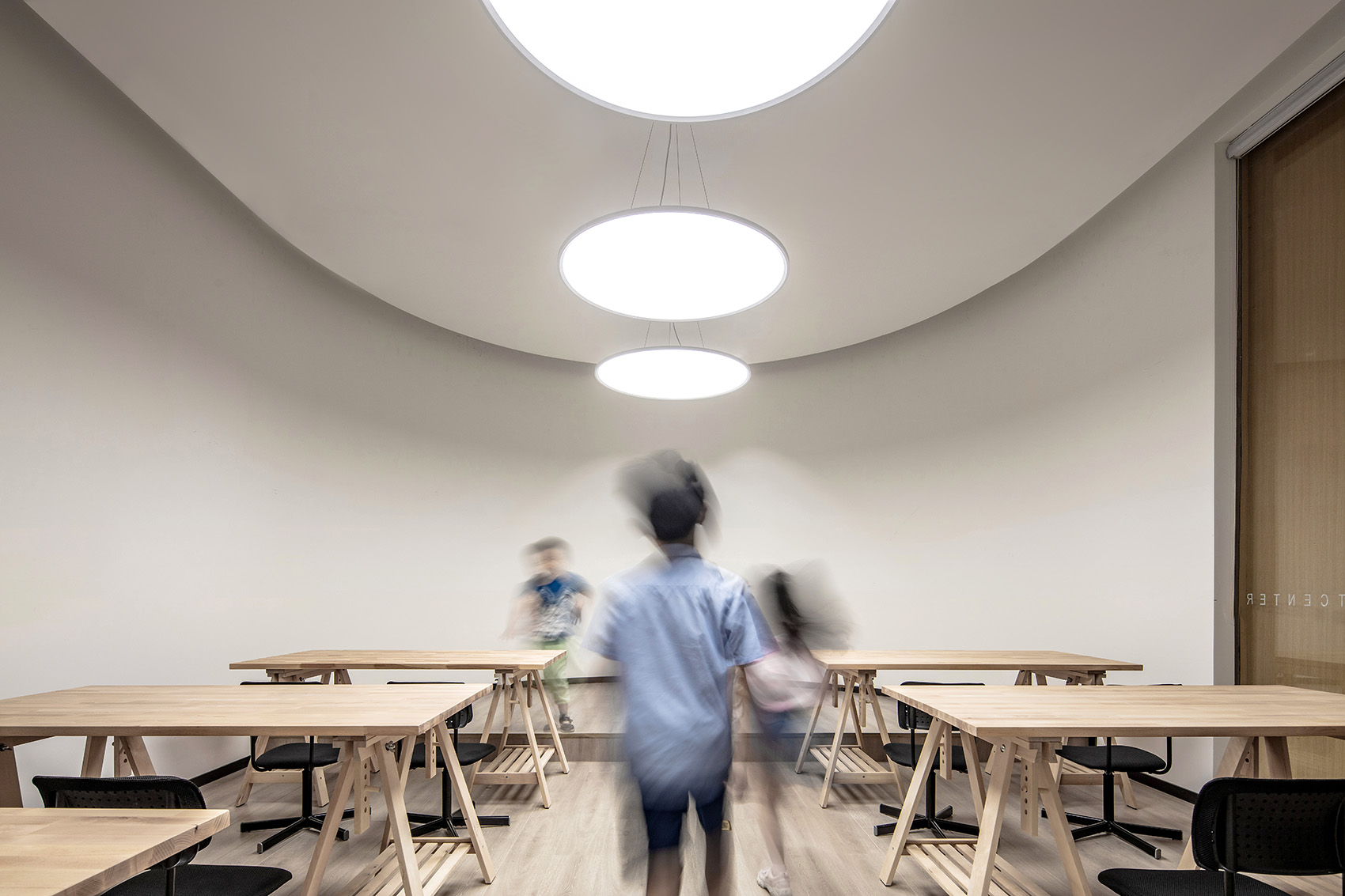 我们运用了孩童最早期麻线团绘画的方式来设计课室平面,让孩子们通过弯曲的视觉探索空间。空间的线性运动不仅启发了他们的灵感,也激发了他们对艺术的兴趣与好奇心。这样的设计不仅提供了功能性的课室安排,还为孩子们创造了一个富有创造力和想象力的学习环境。