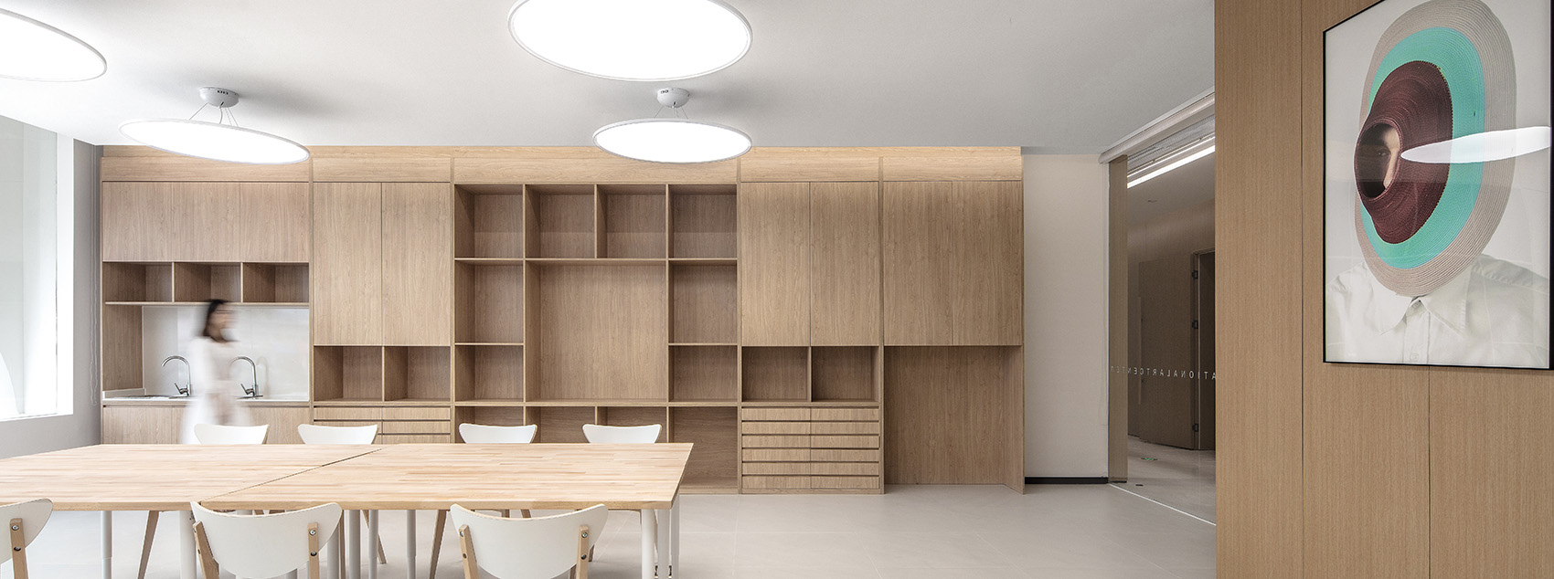 在入口处的8米高空间,我们打造了一种充满仪式感的体验,让人们进入艺术中心时仿佛踏入了一个神圣的教学空间。这个空间以其静谧的特质而著称,在光线的照耀下,它触动着每一个心灵。