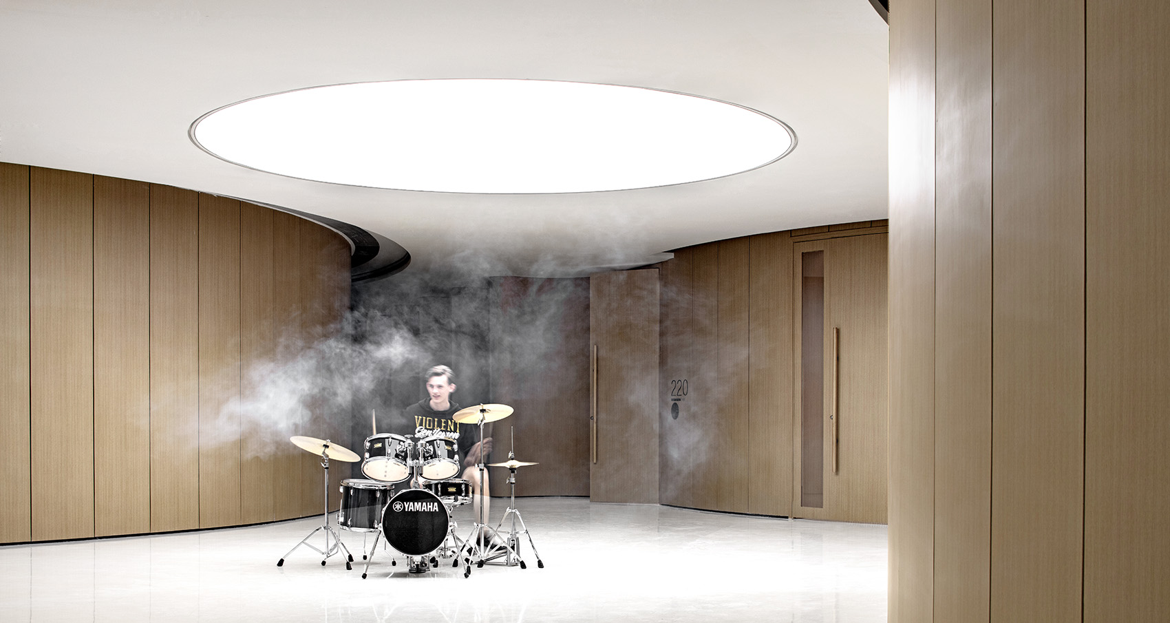 而在二层,沿窗边自然光最充足的是美术课室,中间是乐器教室的组团和一对一钢琴室,而最深入的课室则是带有专业隔音系统的声乐教室团组。
