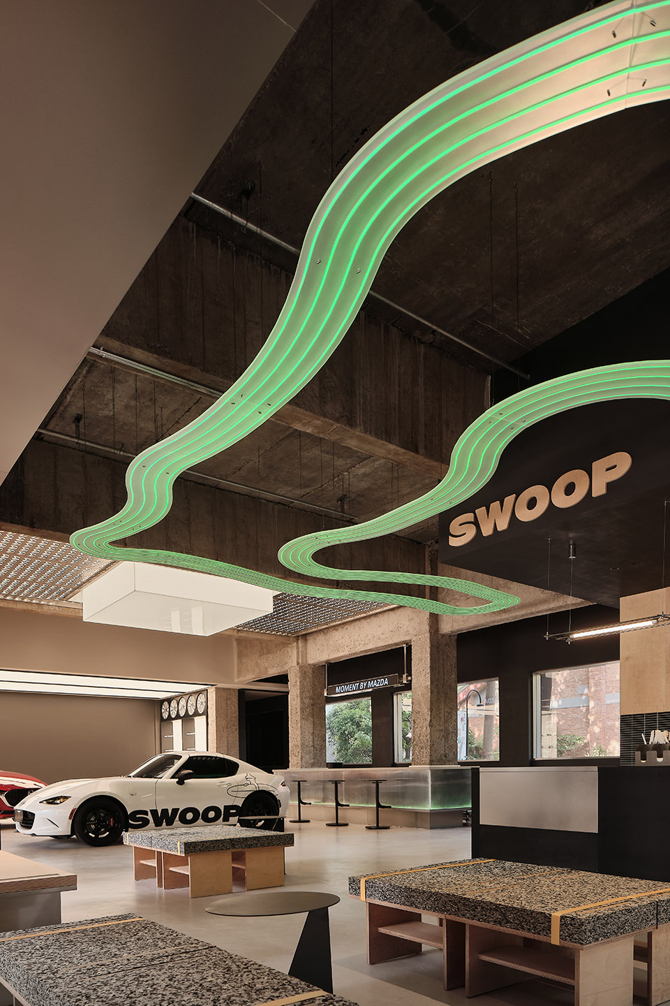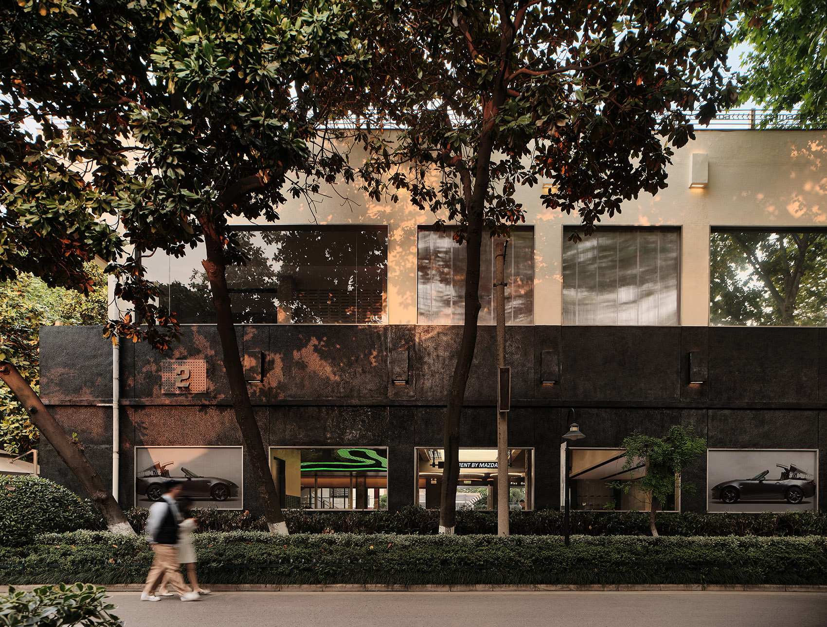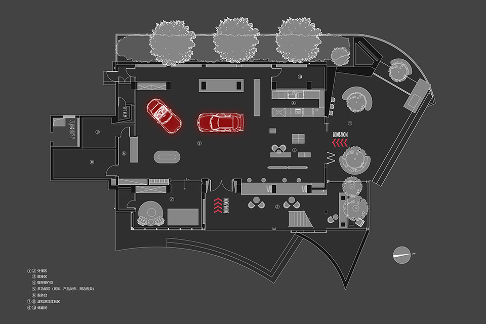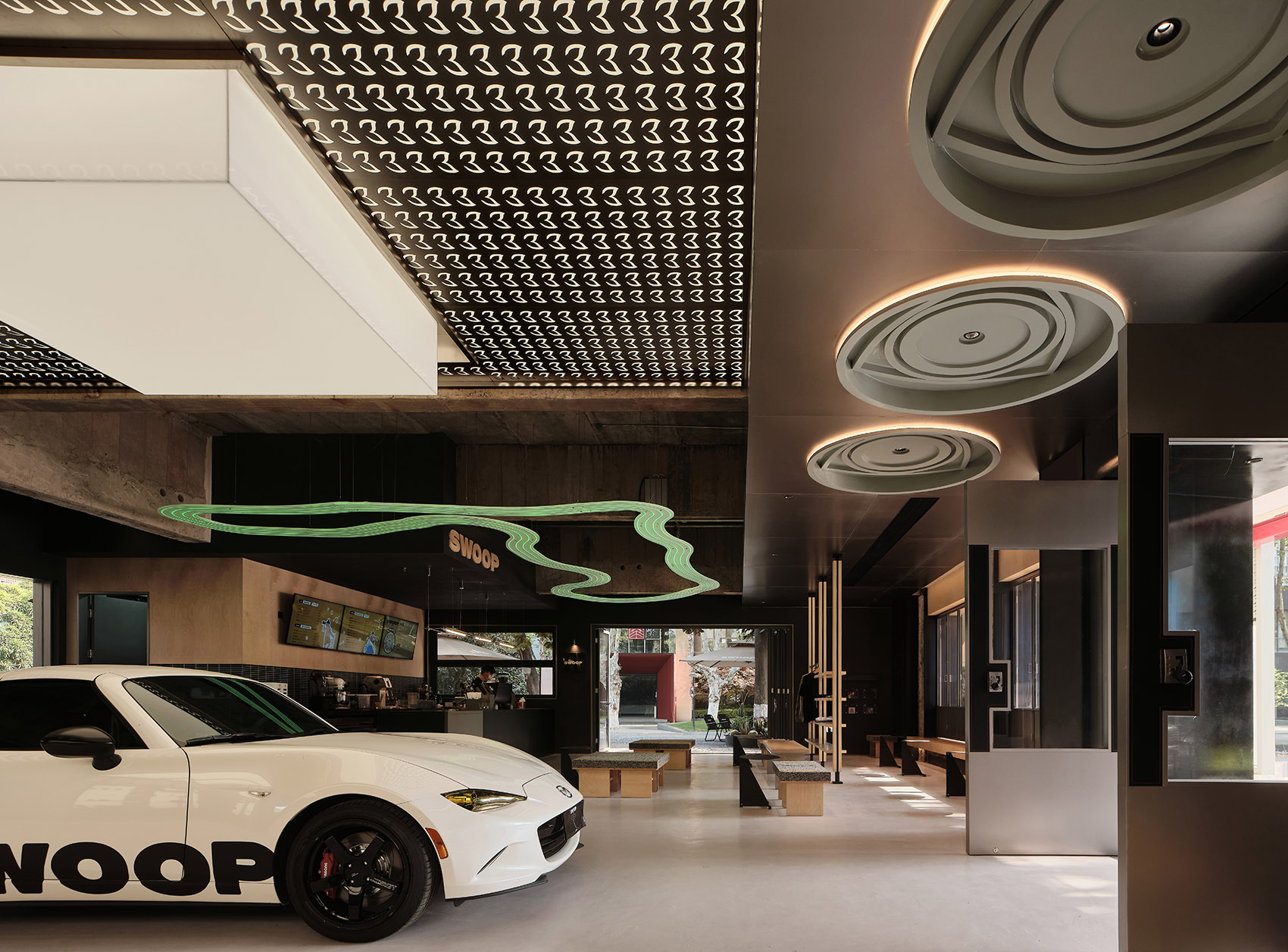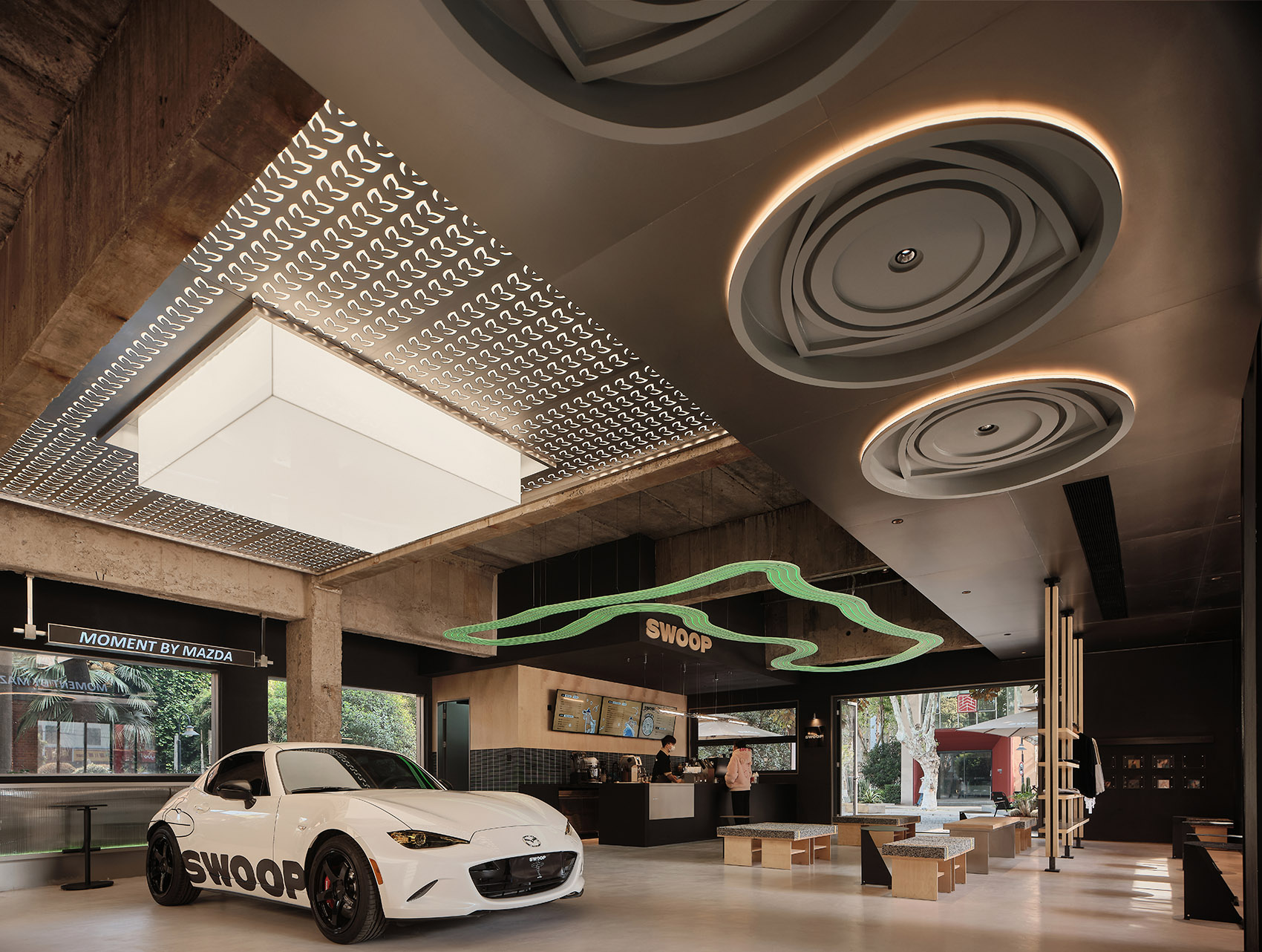 在设计初期,设计团队与业主进行了多次线下沟通,并深入研究马自达品牌文化和设计任务书。他们不仅分析了当下传统汽车服务空间的现状,还结合了长马新业态中心的经营理念,融合了年轻客群的消费观和审美趣味,以打破传统汽车服务空间的沉闷单一模式为目标,进行了空间设计。