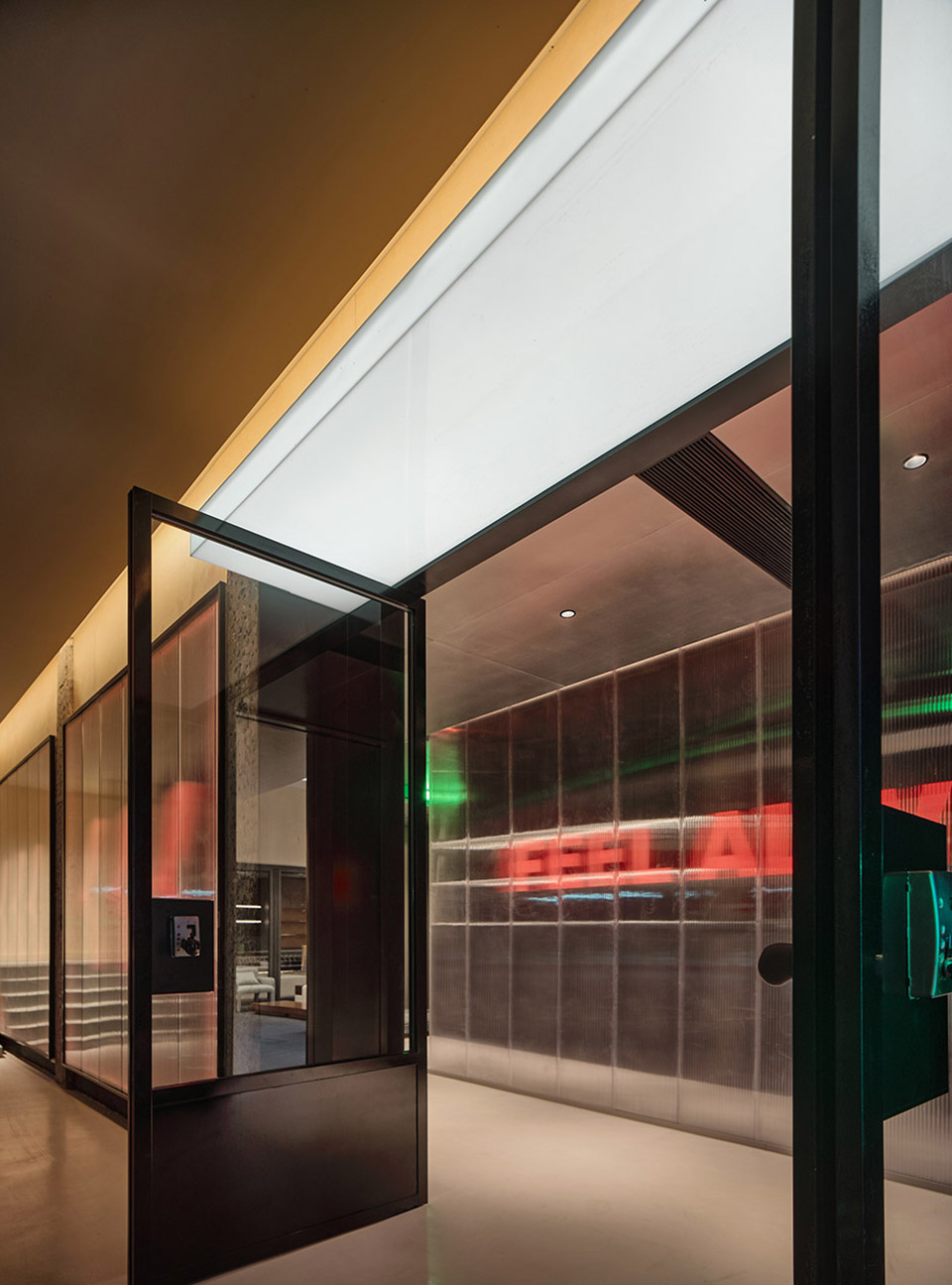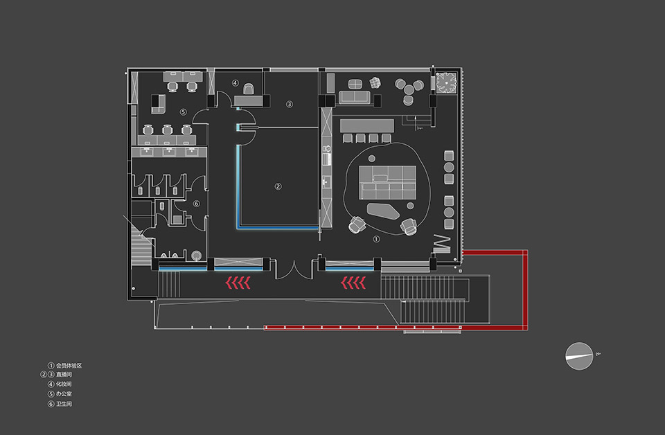 二层空间需要较高的私密性,因此通过装置化处理墙体和走廊,使得整体空间更具活力和趣味。会员体验区的设置使得空间更加亲和惬意,延续了一层空间的设计风格。