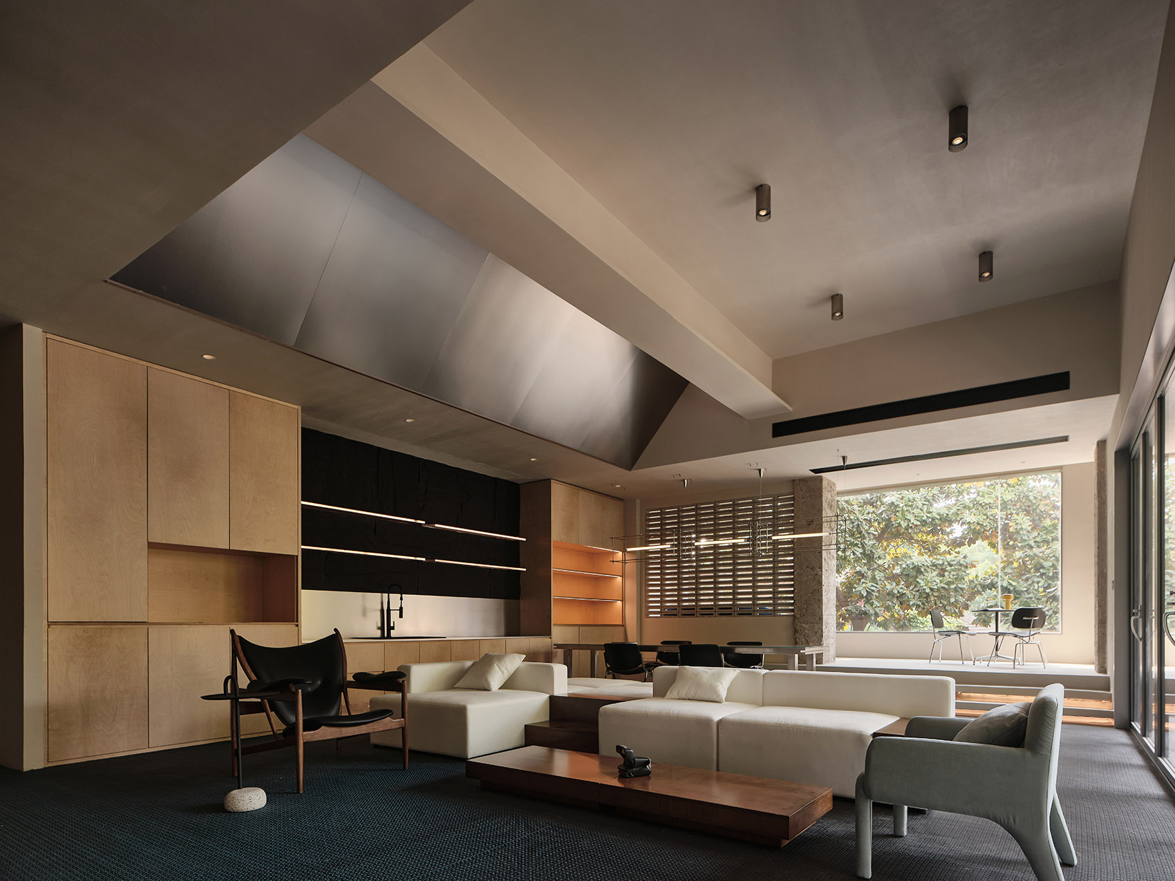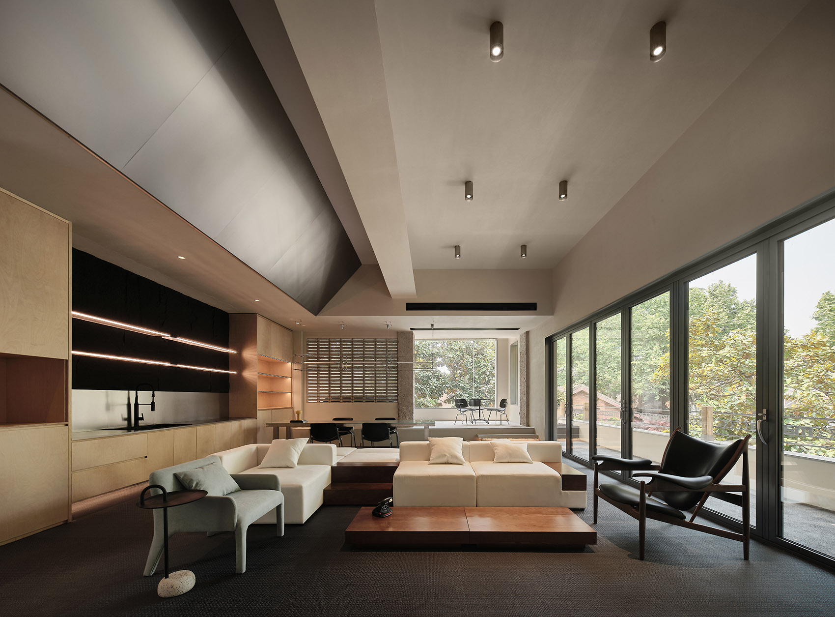 一层空间需要更加灵活开阔,因此通过具体量感的吊顶和大体块进行空间划分,丰富了空间的体验层次。在室内外边界处理上,采用了具有功能性的体块,提升了空间的互动性和开放性。