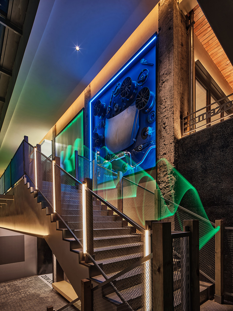 色彩方面,延续了马自达品牌的黑灰色调,但通过金属材质的运用增加了流动光感,使得整体色彩更加时尚、年轻。同时,红色被引入作为品牌的重要元素,以展现奔放热情。品牌LOGO被重新提取和演变,融入到具体空间中进行表达。此外,转子发动机作为马自达重要的历史符号也被再次彰显。
