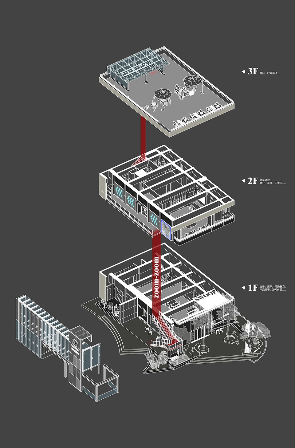 The first floor space needs to be more flexible and spacious, so it enriches the experience level of the space by dividing the space into specific suspended ceilings and general blocks. In terms of indoor and outdoor boundary treatment, functional blocks were used to enhance the interactivity and openness of the space.