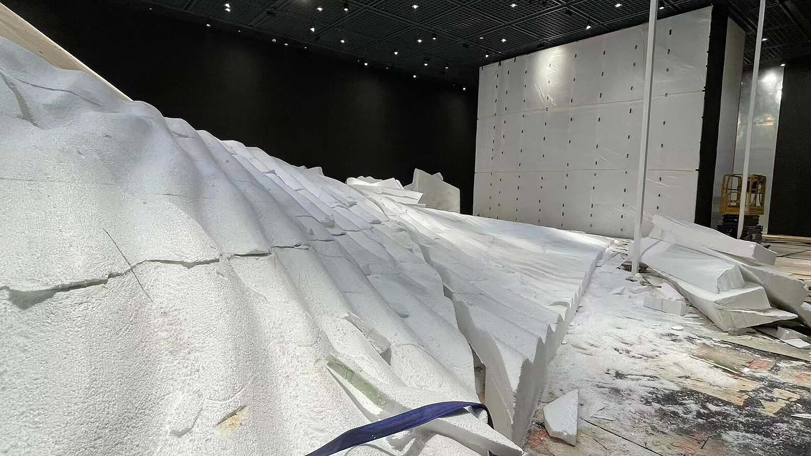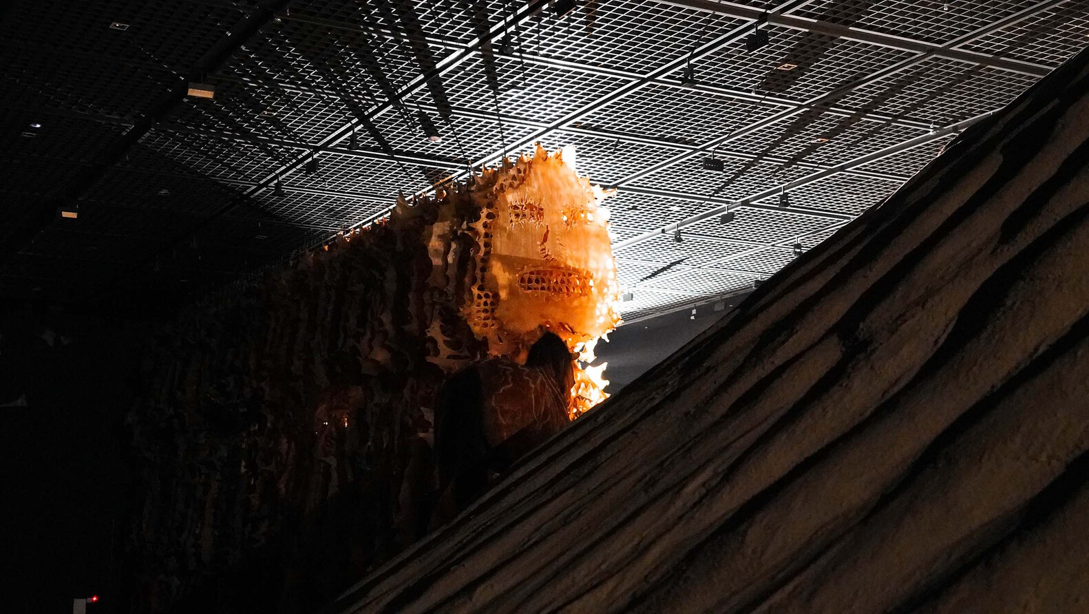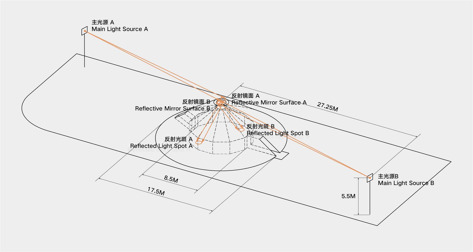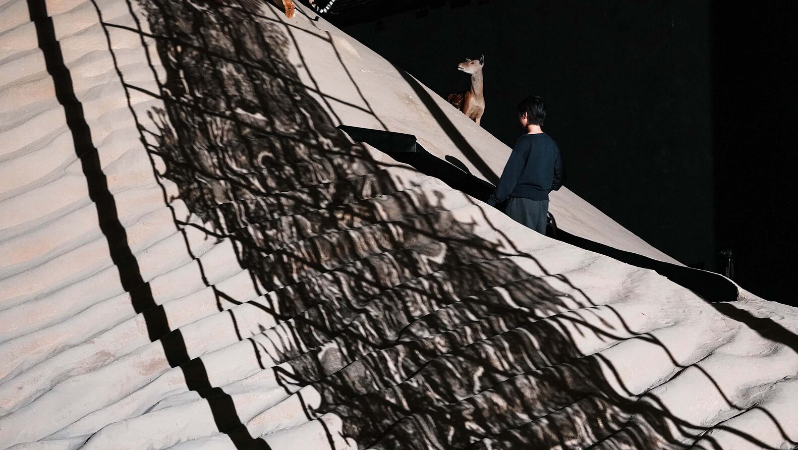 场地对角线上的两盏探照灯构成展览的主光源,是东升西落的人造“太阳”。两盏主灯每间隔一分钟交替亮起,使有限的空间和作品在不同的光线环境下呈现不同的姿态,并将作品照射在锋利的光线之下,刻画出空间纯粹的几何形状。我们在沙丘顶端的洞口处悬置了两面镜子,将光源通过镜面反射引向沙丘内部,启示般的光影在顶部倾下,照亮沙丘内部的艺术作品。移动的人影,流动的沙地,变化的日光,虚构的反射,空间和作品一起,一层层地将观众卷入艺术家的神秘叙事之中。