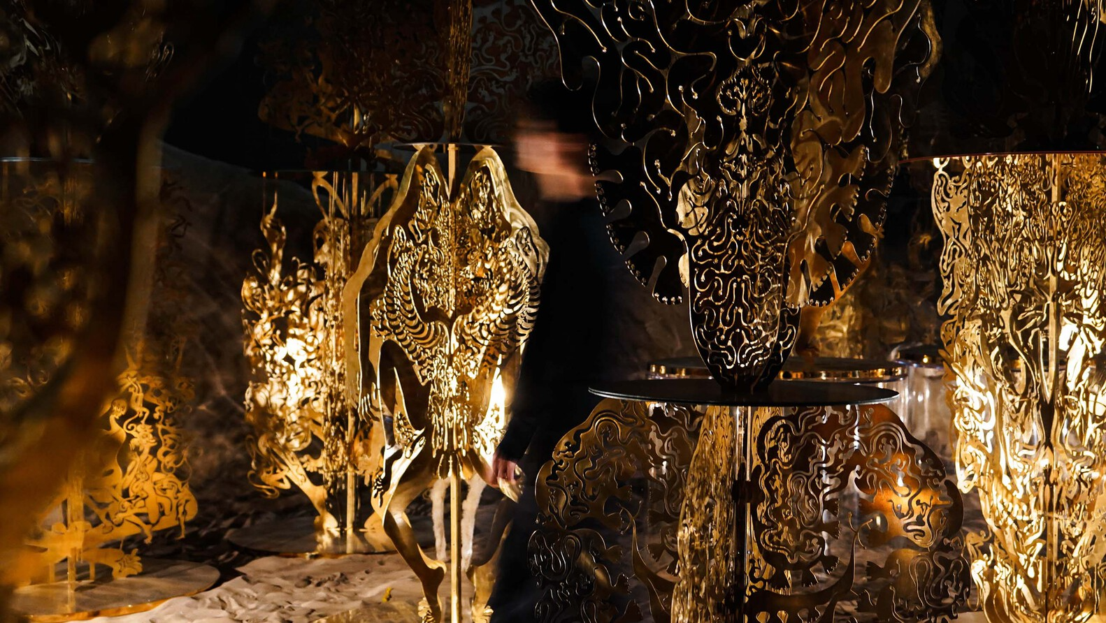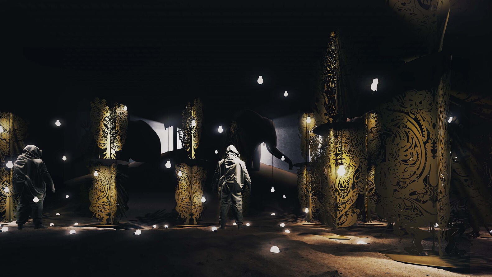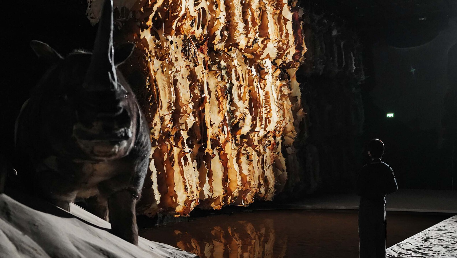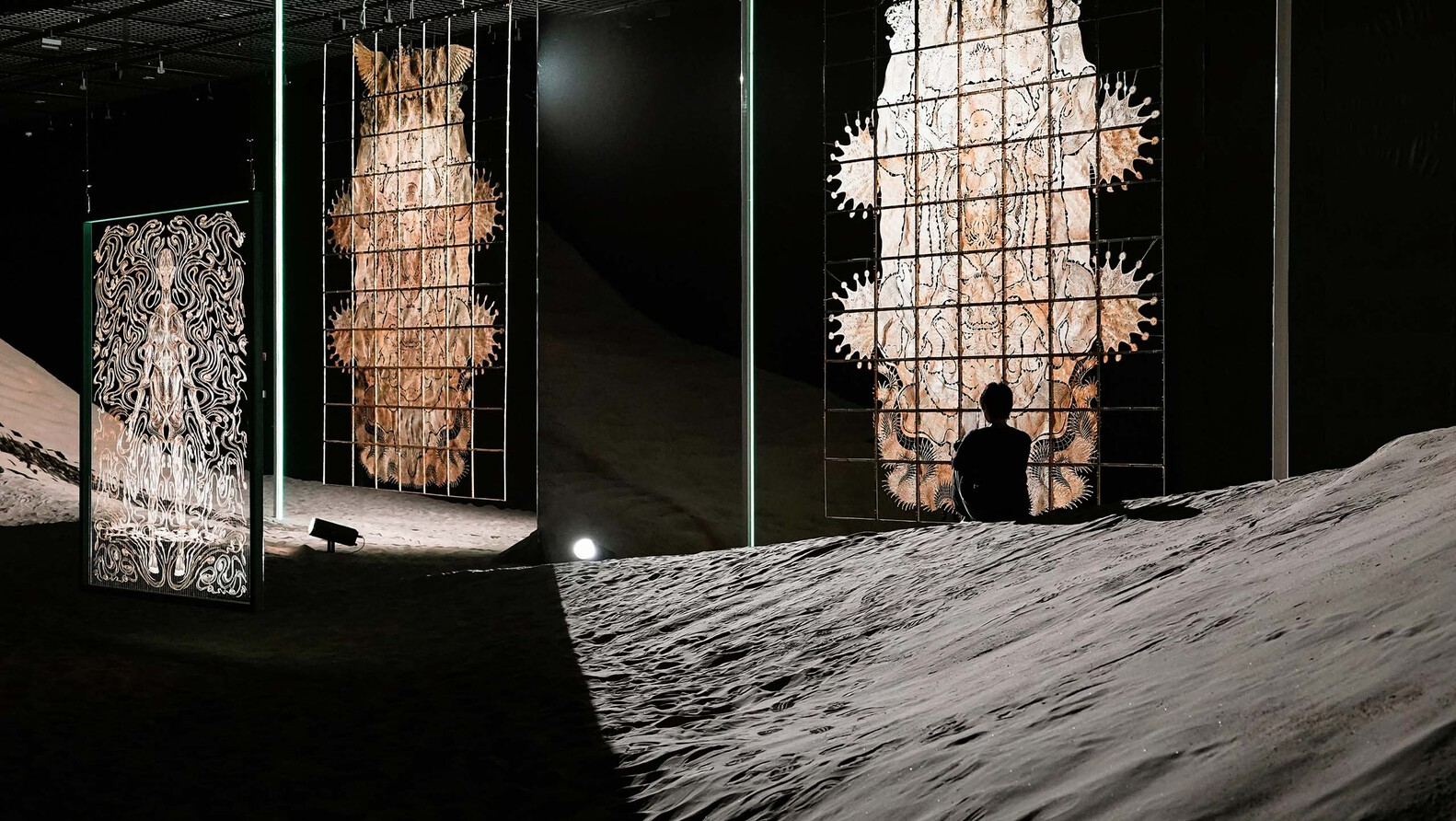 绵延的沙地中,脚印是观者与这个世界对话的见证。当双足深陷其中,炙热的光线越过沙丘,作品“征兆”的异兽剪影会出现在润满墨汁的墙面上:九个脑袋的猛虎、生出四颗象牙的巨象、眼生于臀的梅花鹿。这些动物皆“身怀异像”,就如《山海经》中记叙的奇兽,预示着某种窥视未来的神秘信息。它们矗立在中央沙丘的坡面上,随着观者步伐的移动逐渐展现,带领我们坠入艺术家创造的世界之中。