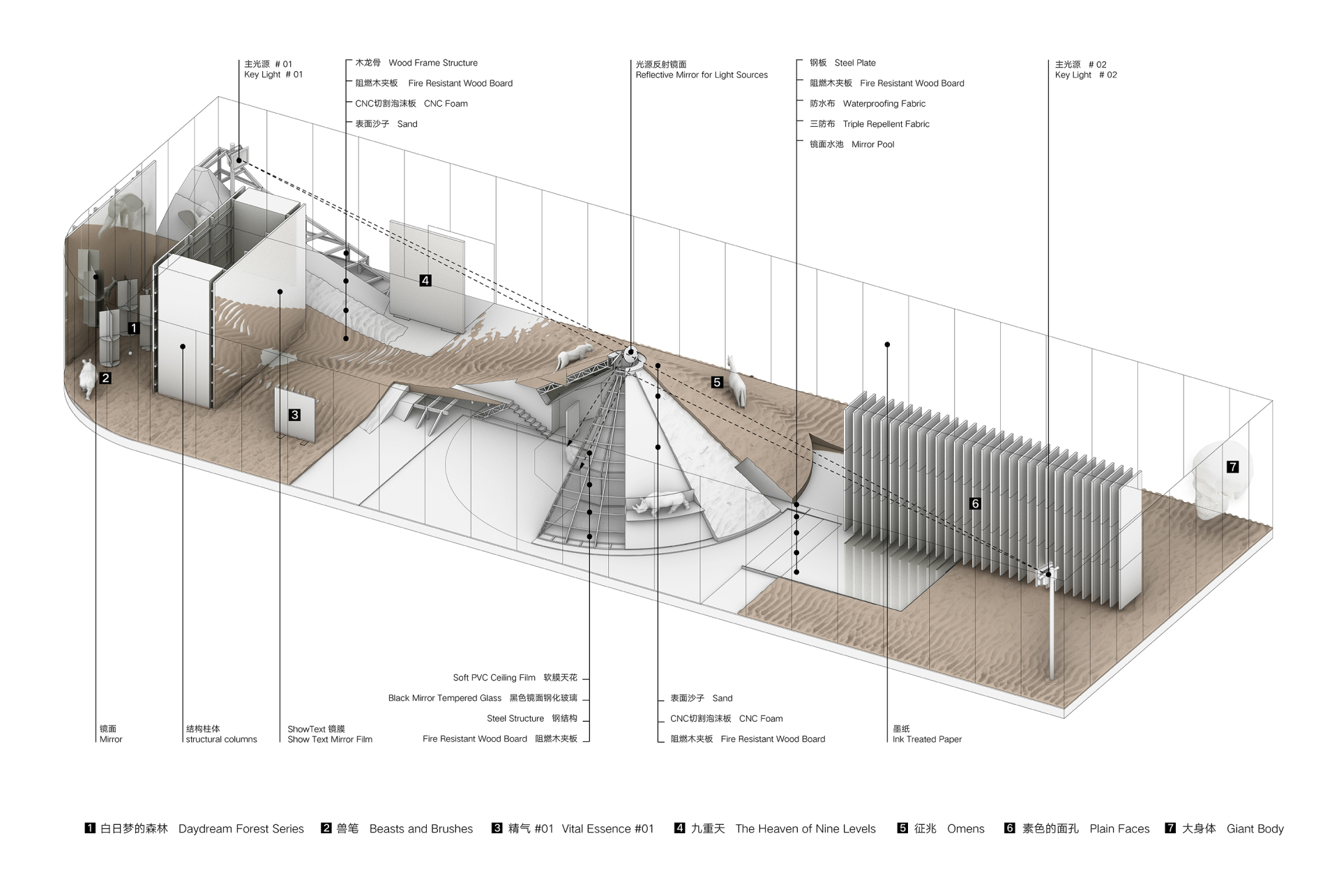 沙漠、镜面(包括水面)和光线是营造梦境的关键。展览空间以巨大的地面构筑划分展区,并不做分割,形成连续、有对望关系的空间体验。展陈团队经过多次实验,最终选择以泡沫切割板作为沙地肌理的基础,并在不同的面层适配不同颗粒度的河沙,形成既有耐久性又能保持良好流沙形态的地面。