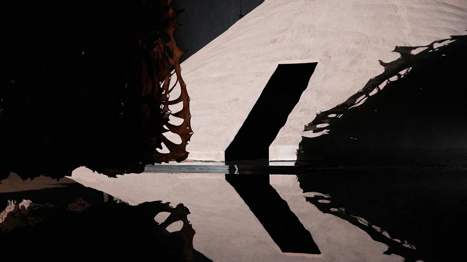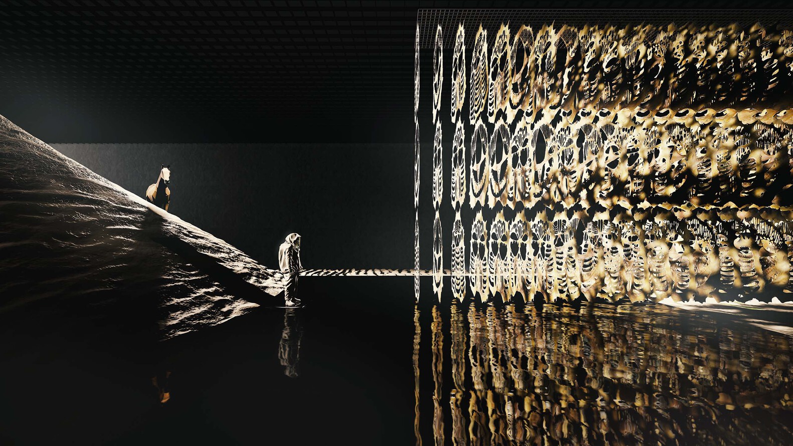 我们以镜面将结构柱隐藏,并将作品“白日梦森林”置于平行镜面之间,使有限的作品在虚像空间中无限延伸,点缀点点星光,形成森林的广袤和幻想。面对沙丘的镜面将空间折叠,形成模糊真实与虚幻的界限,作品“九重天”的虚实两像构成梦境的主体。在沙丘的尽端,作品“素色的面孔”悬挂在黑色的墨池中,与静默的水面构成另一个维度的镜像关系,观者在这里凝视一场虚实的空间幻境。