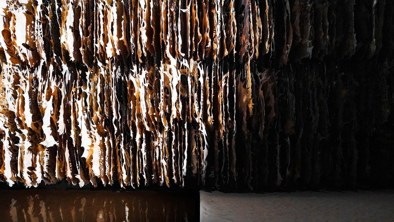 从沙丘中的洞穴望去,眼前是一片坐落在沙中央的“黑色海洋”:无边的水面,开阔的空间感受,阵列的牛皮从水面一直延伸到无法抵达的对岸。太阳在眼前东升西落,在黑暗中走向了这一场永恒的轮回。