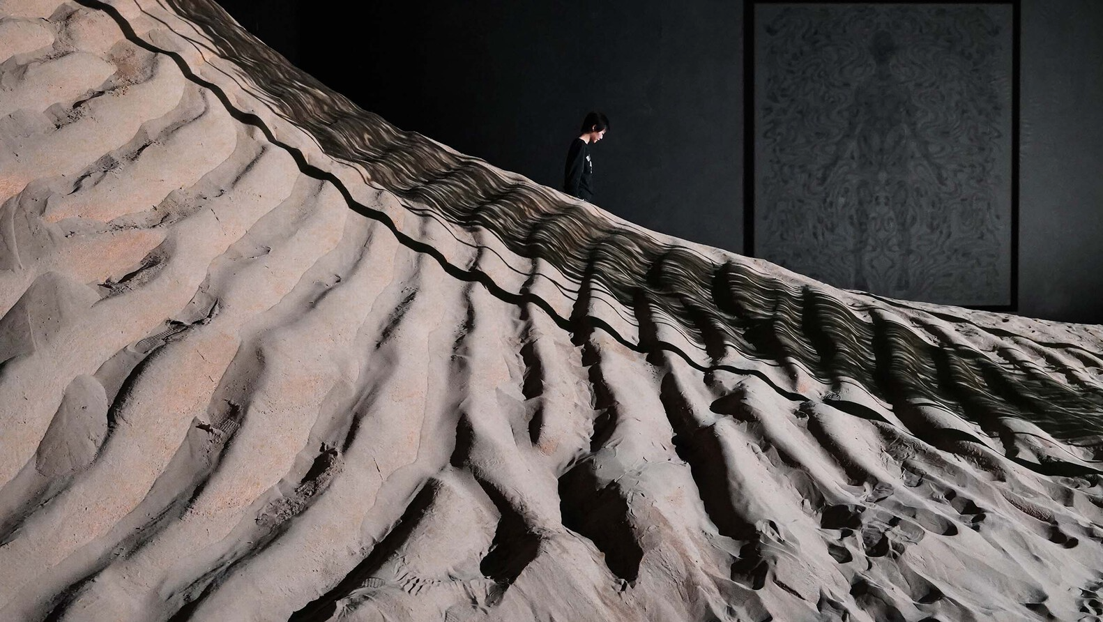 行走、运动、知觉,是展览体验的重心,整个观展过程就像一次远古世界或科幻世界的探秘之旅。整个展厅被沙所覆盖,我们在展厅中心建构了一个直径17米的巨大沙丘,展厅的流线通过沙的肌理引导,模仿了在真实沙丘中行走的蜿蜒曲折。观众走进被风侵蚀的沙之世界,跟随着作品的叙事开启一场神秘的漫游之旅。