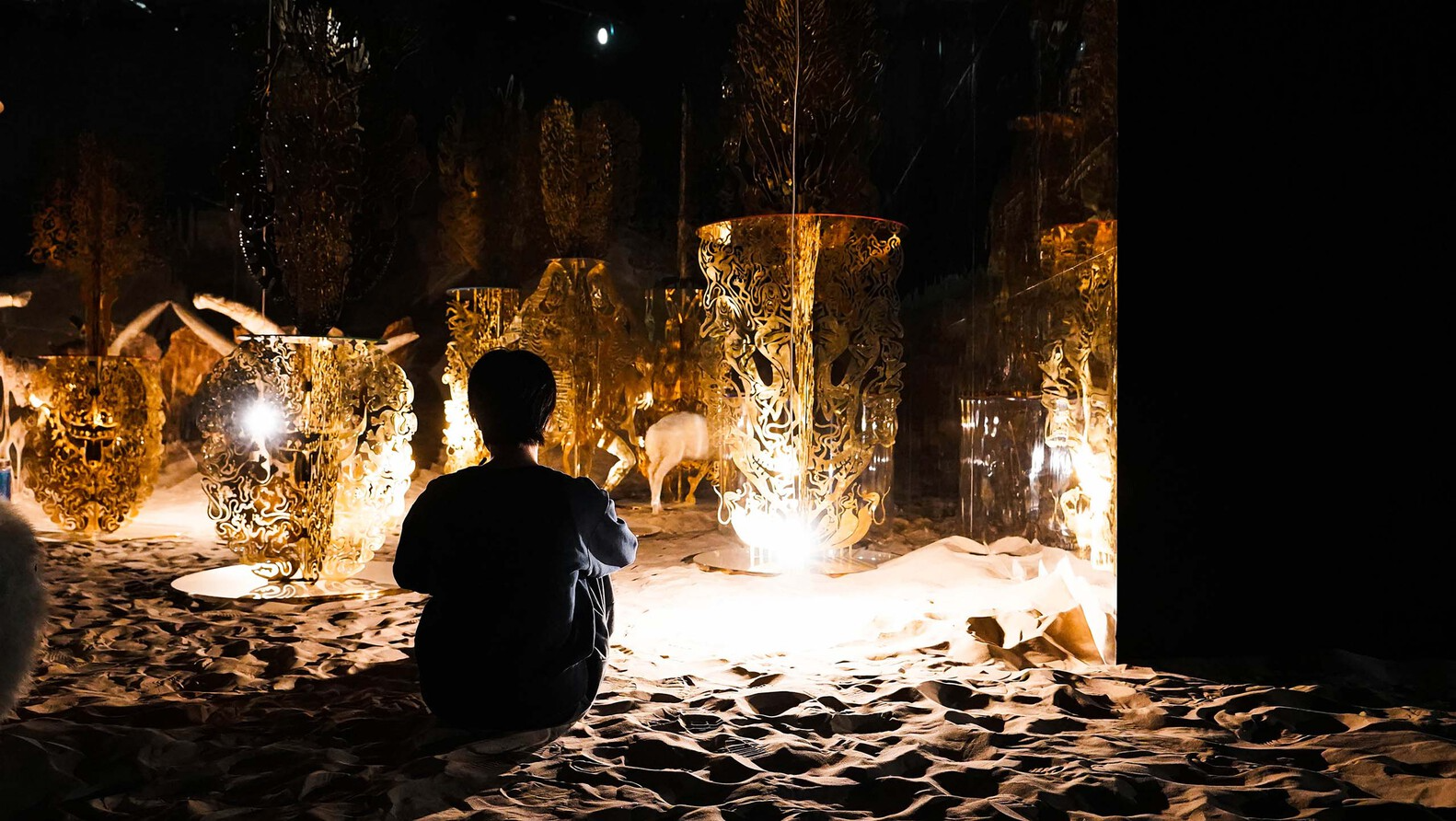 在这一场梦境的最后,巨幕镜墙后方还隐藏着“镜像丛林”的秘密,一方由两幕平行矗立的镜墙围成的空间,作品“白日梦的森林”在镜面内外的沙地上投射出闪耀的光斑。这些承载着迷蒙、幻梦的精神切片阵列在空中星星点点的灯光中,星光和树阵在镜像的世界延展成一场醒不来的梦境。