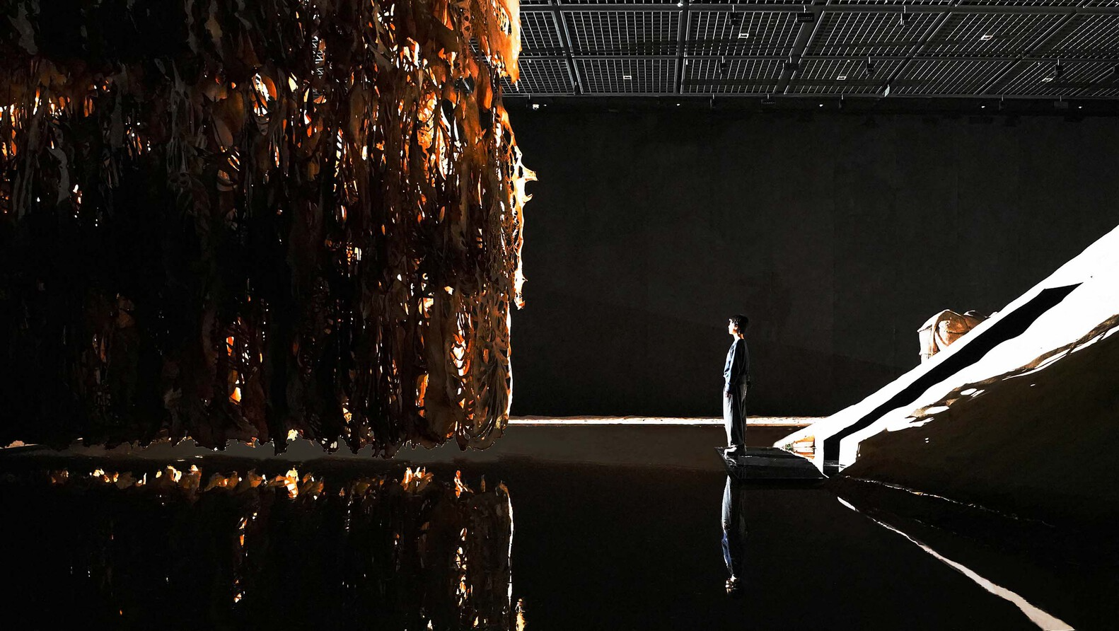 我们在一千余平方米的展厅内营造了一个超现实的场域:五米高的沙丘、黑色的海洋、无尽的镜面、东升西落的太阳,和艺术家的作品共同完成了一场梦境的永恒轮回。我们希望用自然、几何、空间和尺度给观众带来真实且超现实的原始力量,用一种超越时空限制的空间量场,去承托艺术作品在时空与文明间纵横的叙事关系。