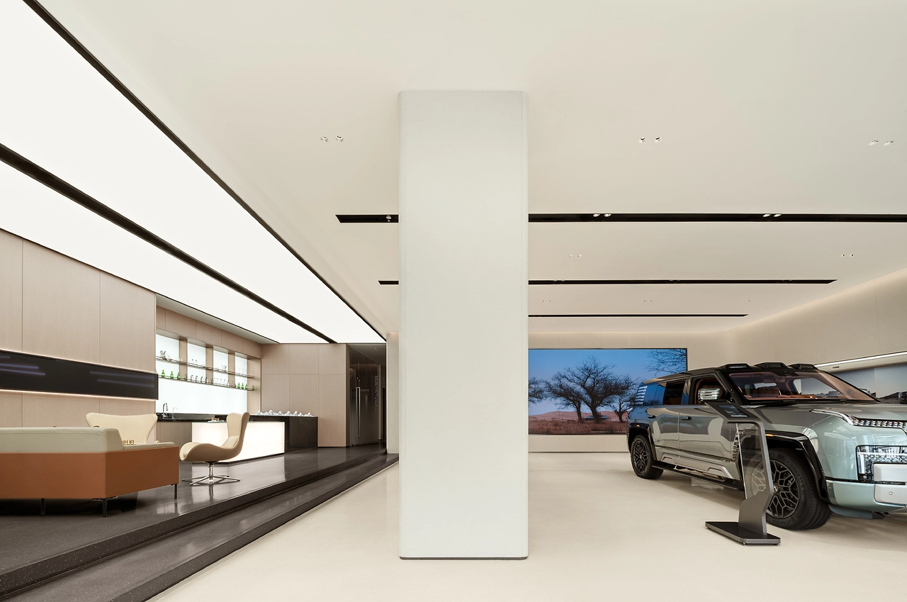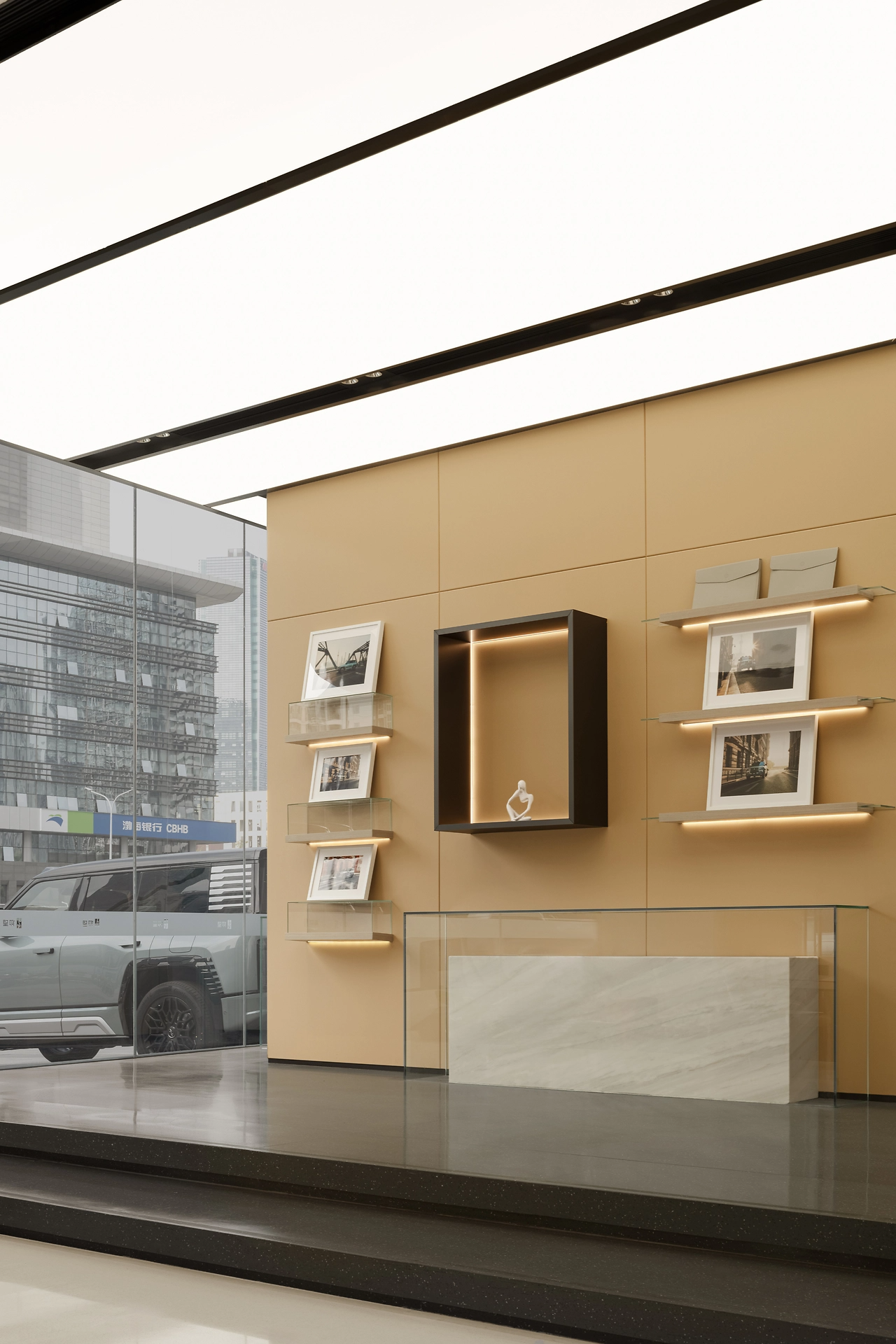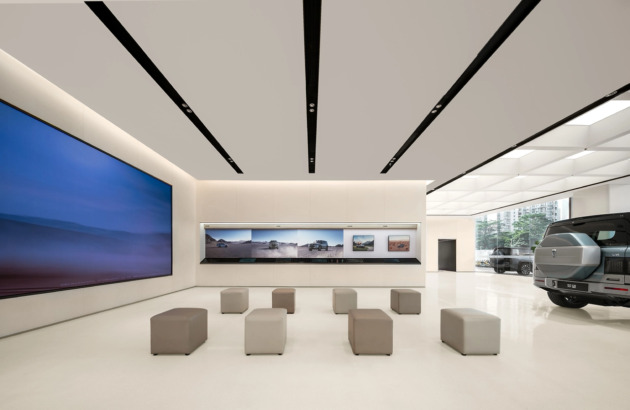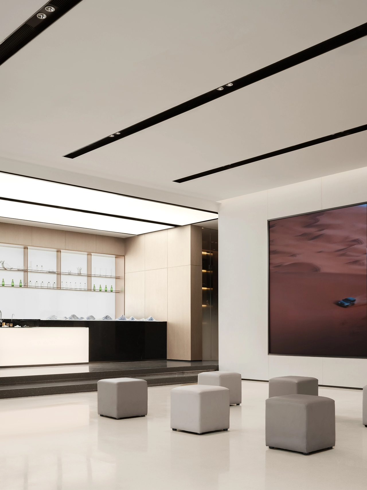 空间的留白,也为展厅带来明亮通透的感觉。晶莹剔透的超白玻组成的玻璃幕墙,以及顶部的分格天窗,最大程度地扩大了采光面积,赋予空间内明朗、纯粹的通透感,为人们带来极致舒适的自然底色。 仰望汽车售后服务秉承精诚初心,大行致广,细微至精,致力于为用户带来极致的服务体验。 展厅设计围绕服务属性的软装陈设以及仪式感互动两方面,展开对舒适环境「温度」以及仪式感空间「温度」的探索。 门店设计透过服务的点点细节奢华与多重感官体验,赋予了人与人之间的信任度,提高品牌的美誉度、专业度与诚信度,达成好的合作共识及令人愉快极致体验。