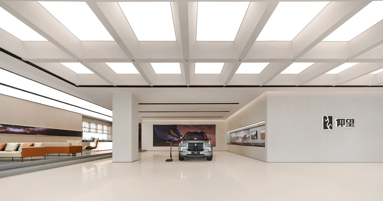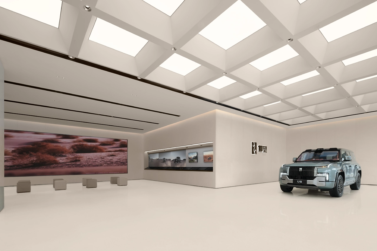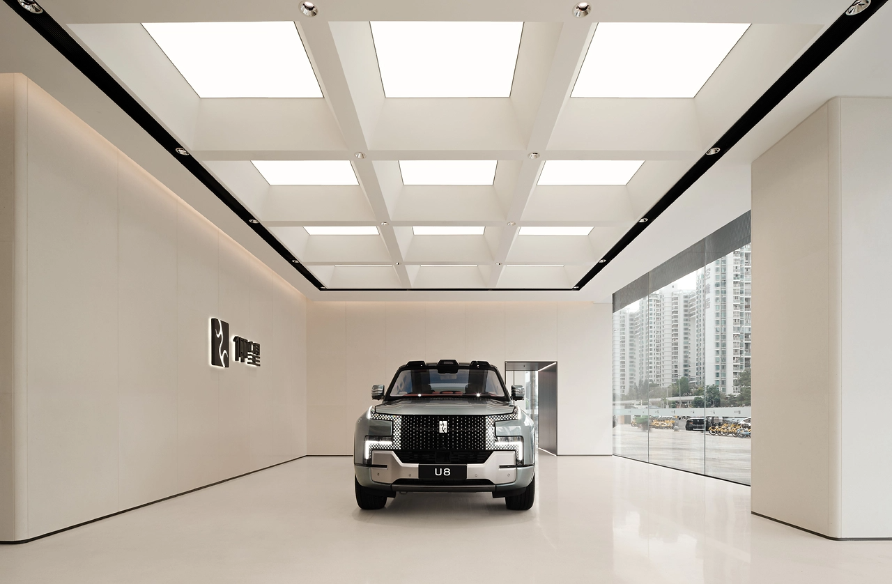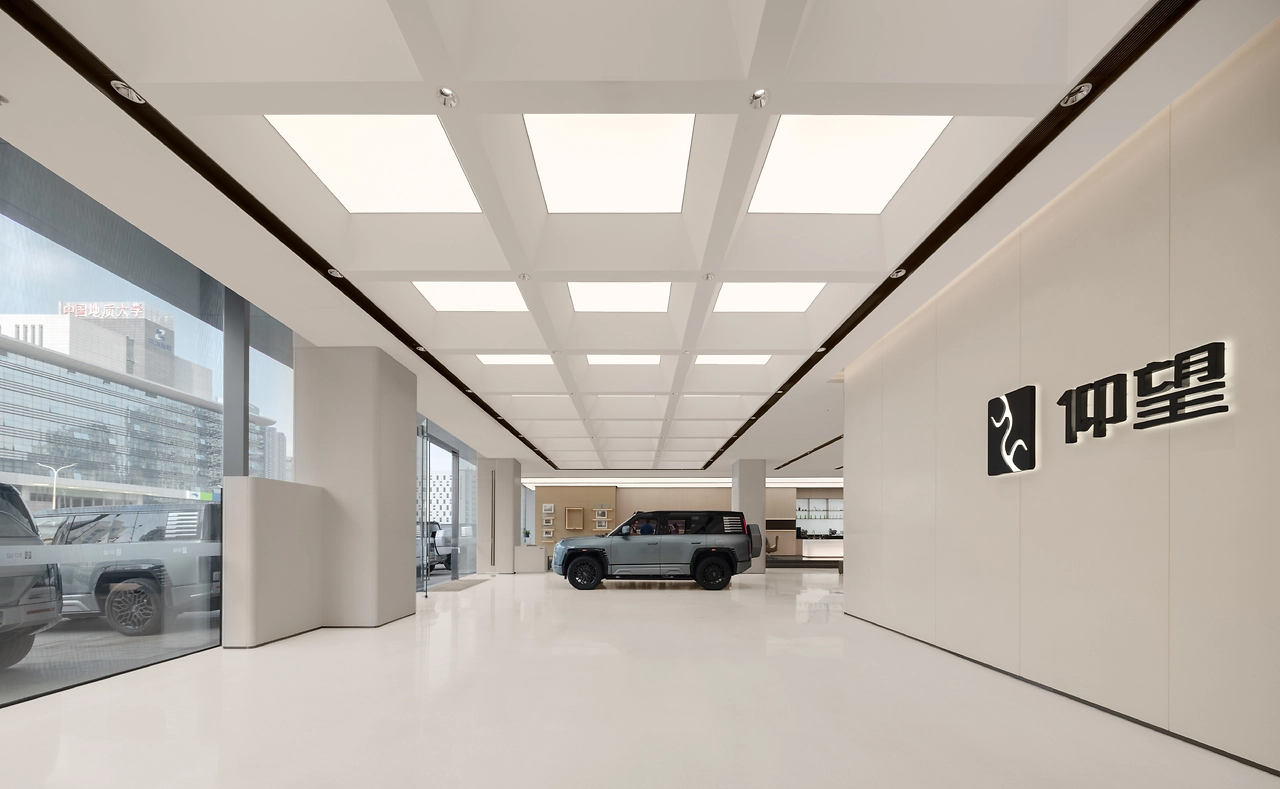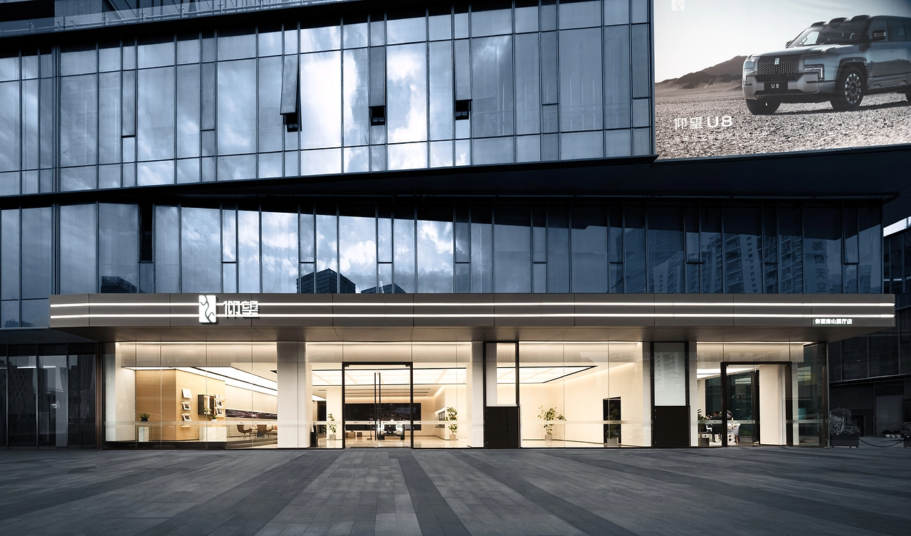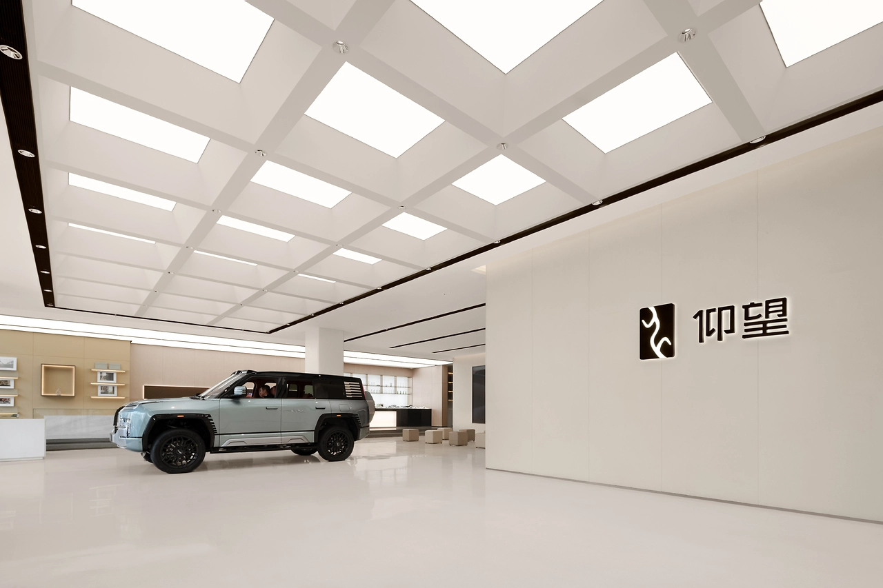 仰望是比亚迪集团旗下高端新能源汽车品牌,依托比亚迪集团创新汽车技术、顶尖工业体系实力、前瞻性设计,为用户提供超越想象的高端车产品。仰望将以颠覆性的超级技术与产品,构建专属于新能源汽车时代的高端品牌。 2022-2024年,格外空间携手仰望,进行终端全店型标准化设计(SI),其中包括以下原型店:10000+㎡4S店、2000+㎡城市展厅PLUS店、600+㎡城市展厅店、300+㎡商超展示店。 格外空间围绕着仰望的品牌精神「敢」,以「悠然之境」为设计理念,建立起“人与车、人与空间、人与人”三个维度的空间叙事关系,以服务设计为起点,进行体验设计、空间设计,系统的定义高端汽车品牌电气化体验空间。