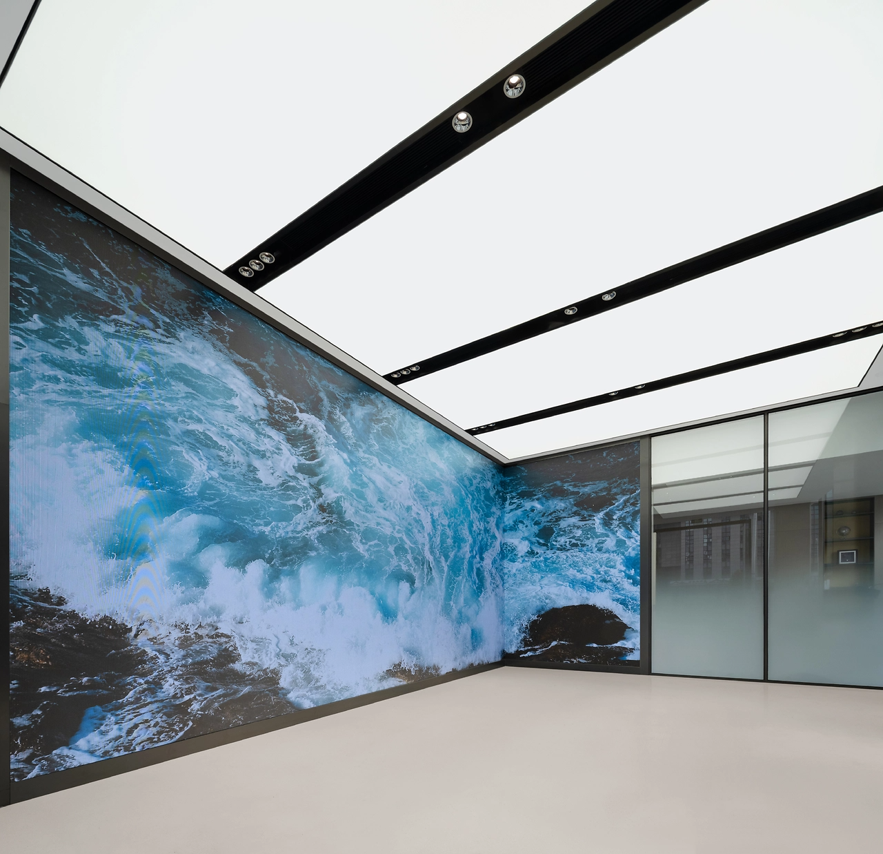 我们把展示区营造成一个巨大的「能量场」,能量中包含着仰望品牌的价值与情感指向,由巨幕屏和内嵌展示墙构成的观赏空间,呈现着汽车背后的能量故事,从外在物理视觉到内在精神内涵,通过能量去指引我们去了解仰望汽车最纯粹的美。 内在元素的共生,与城市文化的共生。大自然包罗万象,又以无出其右的巧夺天工创造万物的恢弘景象。现在我们将这种包容共生的自然之力于仰望品牌展厅中还原。
