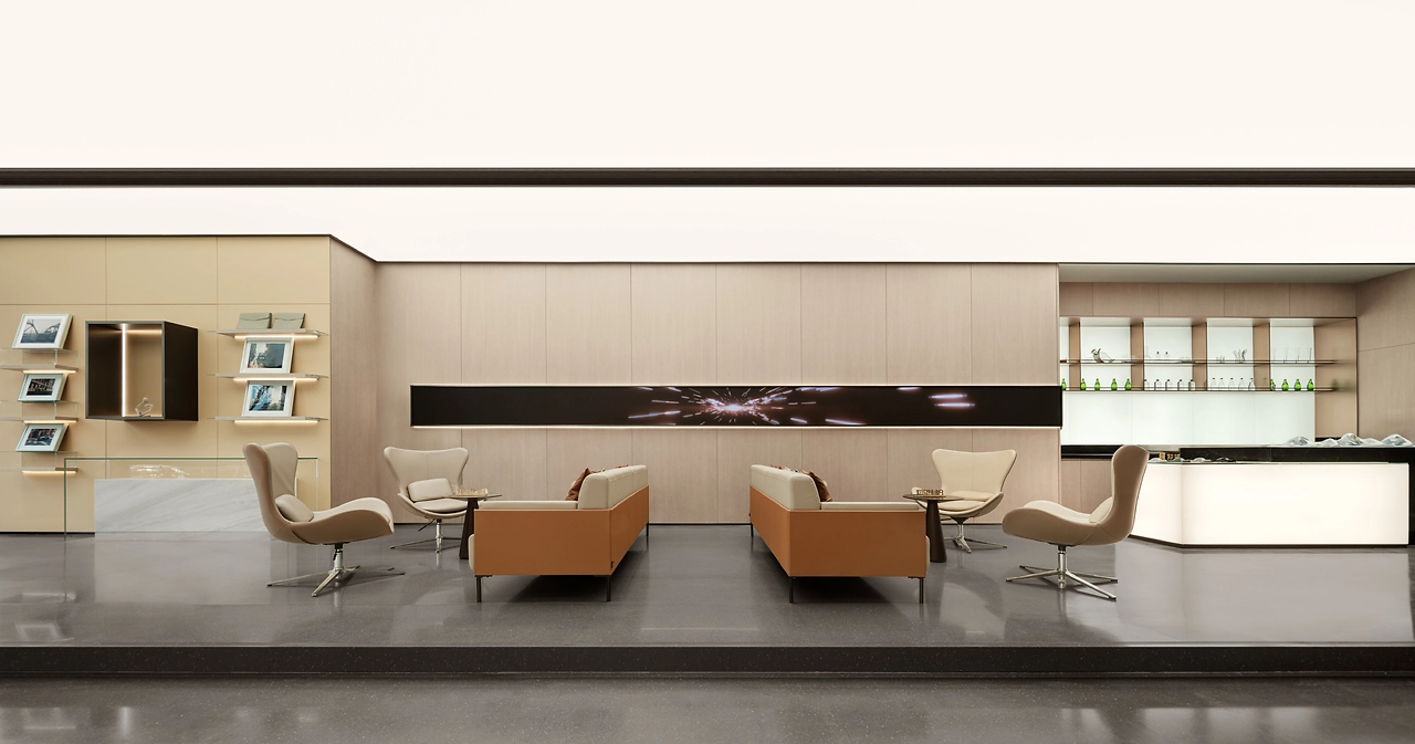 In the Chinese garden art "Wenxin Diaolong", it is said: "The hidden is the essence beyond the text; the beautiful is the uniqueness within the text." Chinese garden art emphasizes shallow exposure and deep concealment. In traditional Chinese dwellings, screen walls vividly embody this technique. Drawing inspiration from the artistic techniques of screen walls. The extra space uses beige marble to create a screen wall that looks up at the entrance of the store, endowing traditional architectural symbols with modern beauty and reinterpreting the deep and profound artistic conception. Pure natural stone and texture are rich in texture, making the refracted light closer to nature and creating a natural and harmonious atmosphere for customers. Looking up at the store located in a bustling area of the city, the entrance screen wall is separated by a wall, creating a space in the midst of the hustle and bustle, and designing the exhibition hall as a private space for customers outside the bustling city.