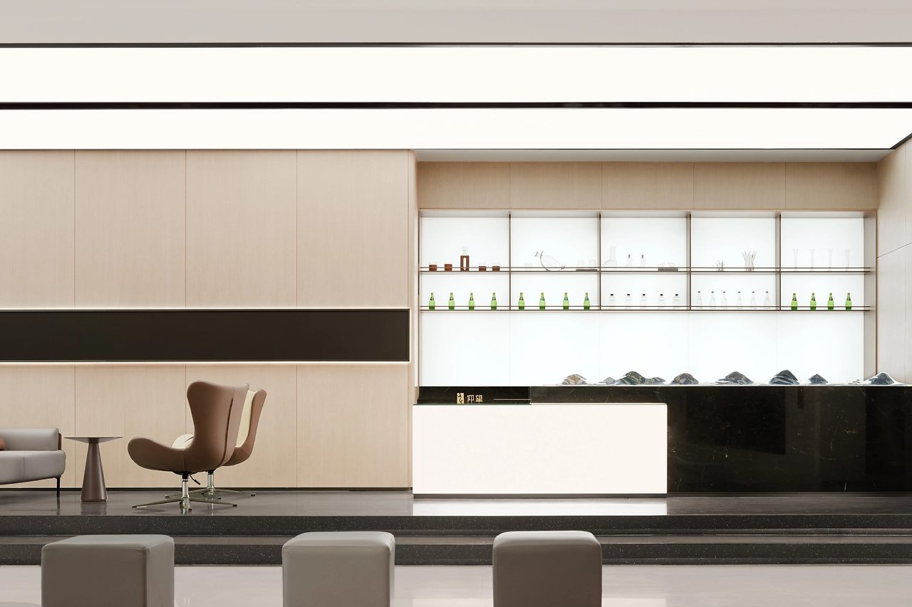 The natural space that is suitable for both rain and sunshine, with scenery at all times, morning bathing in the morning glow, and night watching the stars, embodies the idea of harmonious coexistence between humans and nature. The courtyard is a carefully designed world. In traditional Chinese architecture, the courtyard is a window for dialogue between humans and the world, reflecting the integration of humans and nature. This kind of thinking is also often reflected in Western architectural design. The inspiration for ceiling design comes from Chinese courtyard elements, interpreted by modern aesthetics, using simpler design language to interpret the atmosphere of Eastern style space. Extra Space uses lighting programming techniques to simulate the natural effects of sky light, combining light and shadow, nature and modernity, and pursuing a poetic space with connotation and nobility.