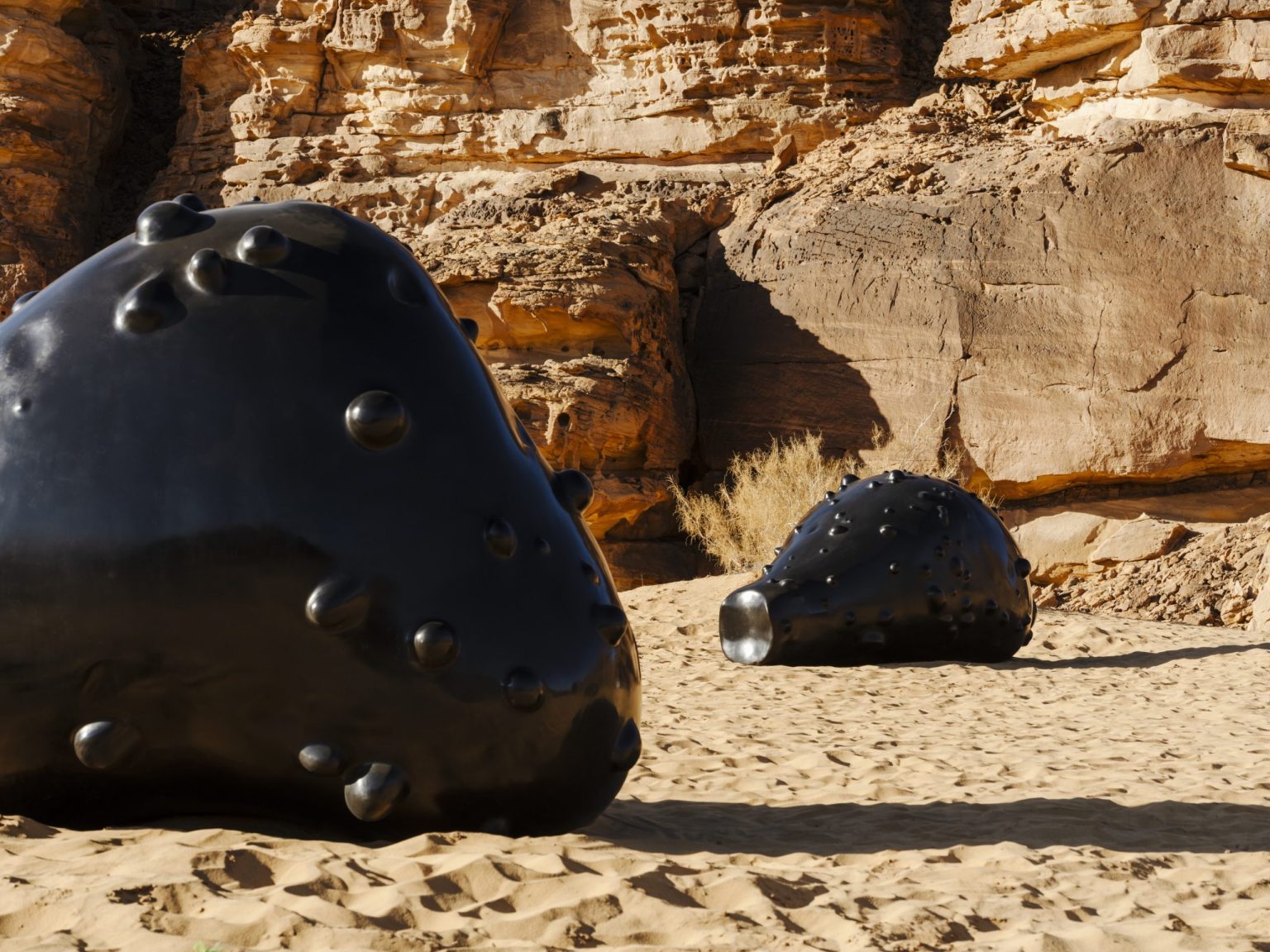 Aseel AlYaqoub’s Weird Life: An ode to desert varnish is inspired by the ‘desert varnish’ that naturally appears in landscapes like AlUla’s, evolving into a luminous veneer with yellow, orange, red and black, and bemusing scientists for centuries.