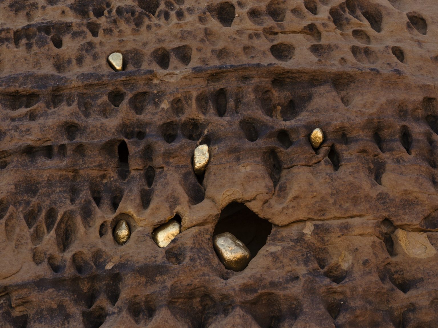 Bosco Sodi 在该艺术作品中收集了各地的火山石。它们被包裹在金色的外衣中,被放置在高耸于沙漠的岩壁上,吸引着观者的目光,让他们去欣赏岩层中已经存在的美丽的有机结构与形态。