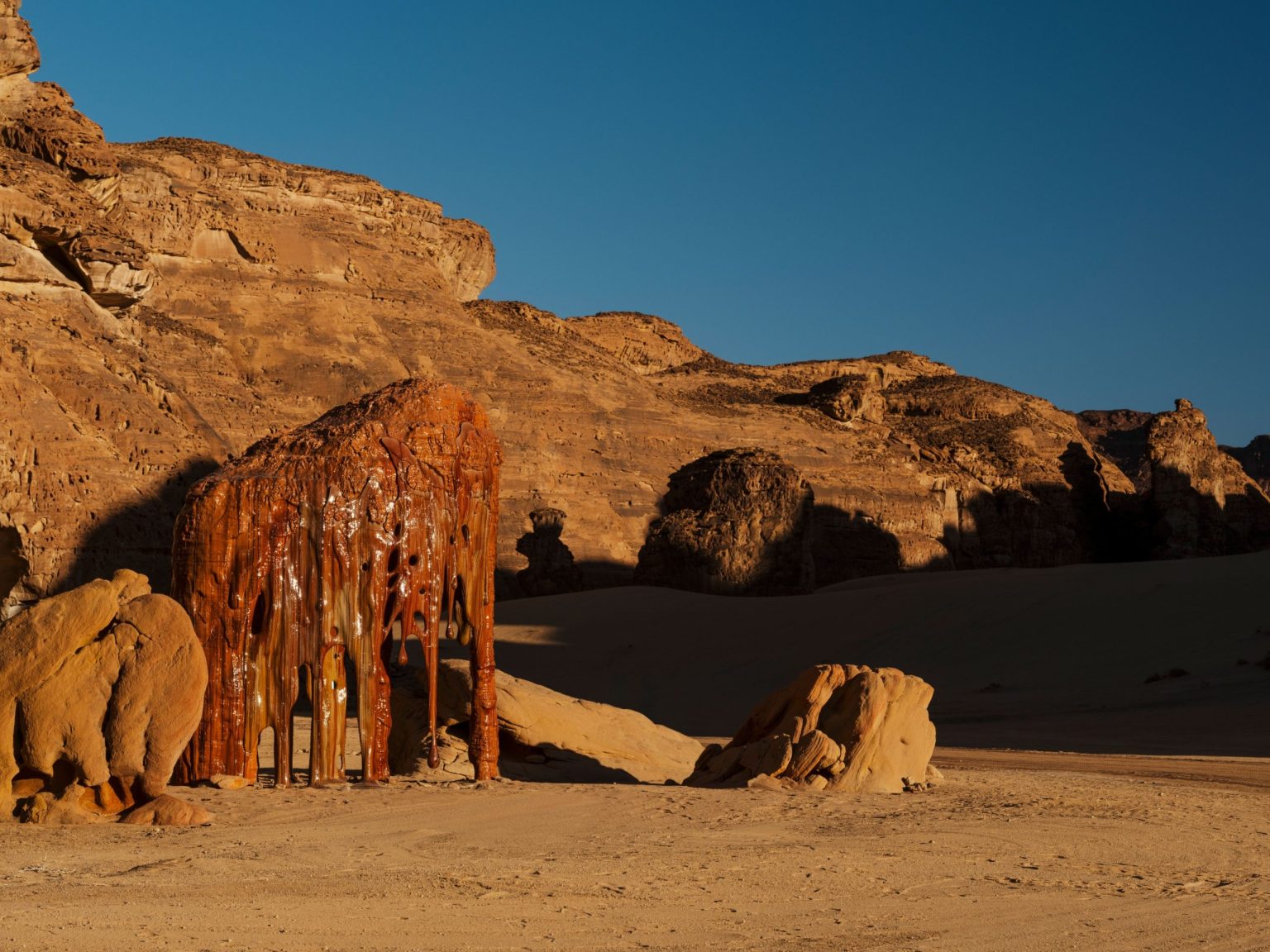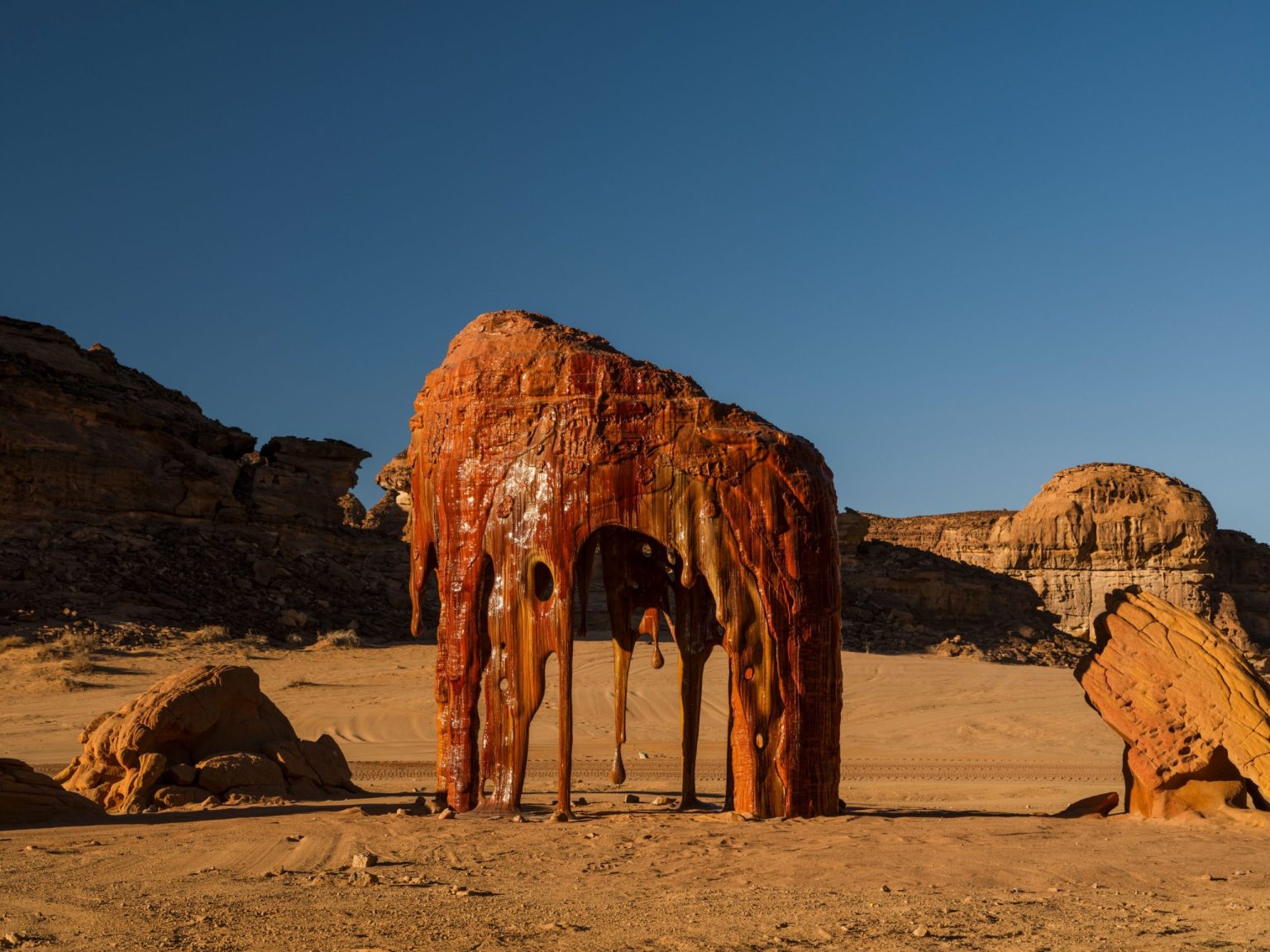 该艺术作品灵感来源于“沙漠清漆”,这种清漆自然出现在像 AlUla 这样的风景中,并演变成带有黄色、橙色、红色与黑色的光滑表面,几个世纪以来一直困扰着科学家。