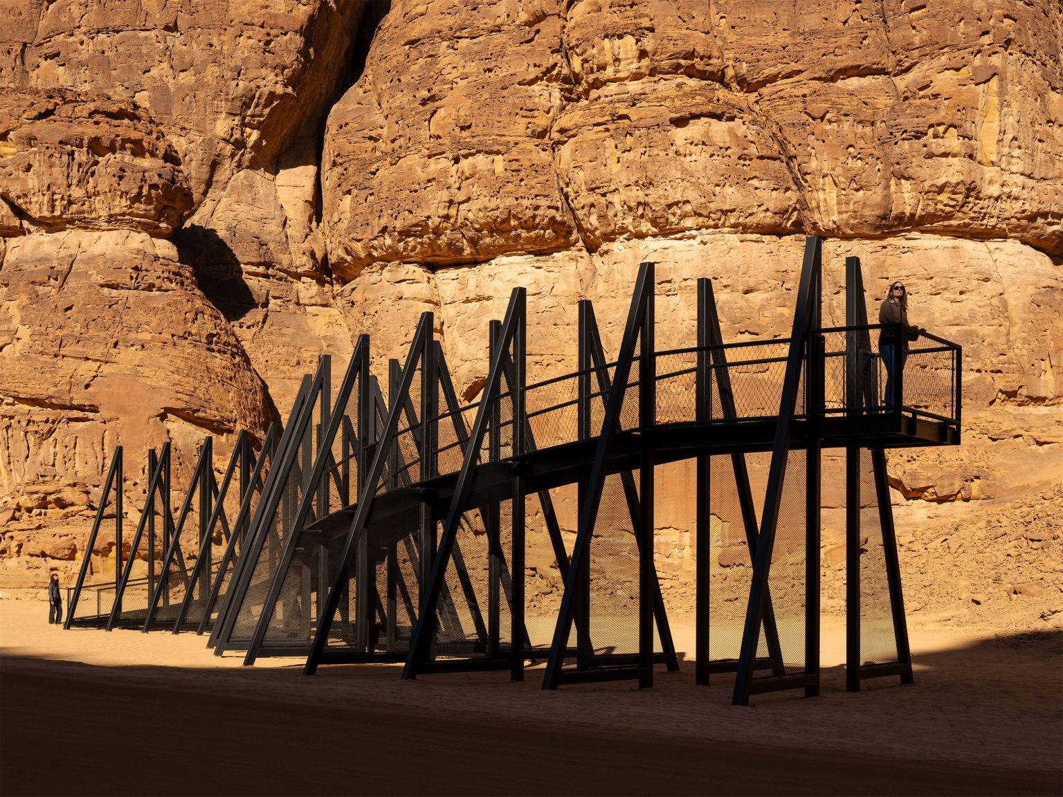 该高架阴影走道的灵感来源于前伊斯兰教时期关于精灵居住在沙漠中的信仰,它采用钢网结构,形成了一条巨大的起伏的黑蛇。