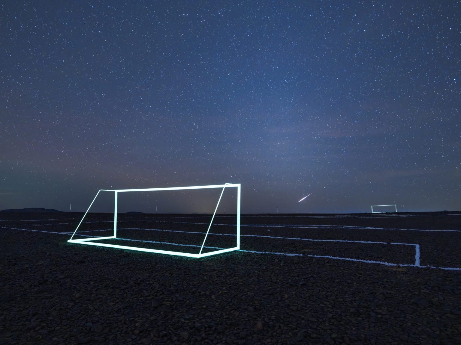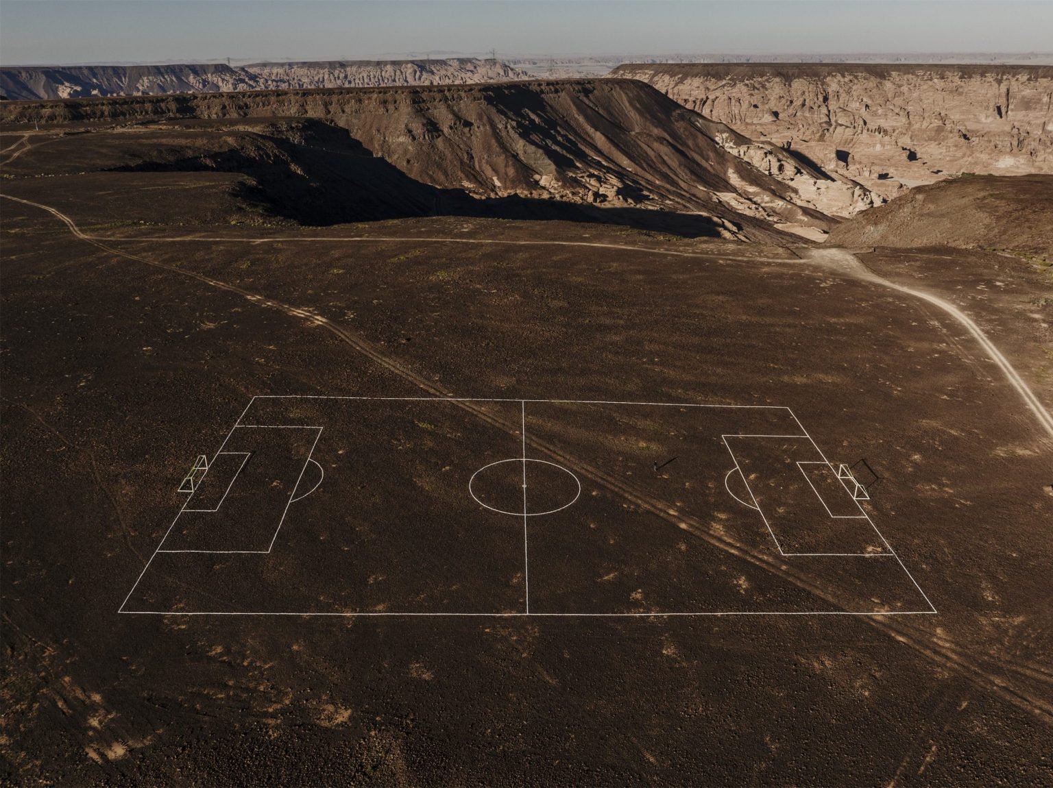 Ayman Yossri Daydban draws the contours of a football pitch with white stones and rocks gathered by the AlUla community from across the valley. Placed in a remote, rocky area, the football field is a mysterious and suspicious presence, provoking collective memory and considering the social role of football.