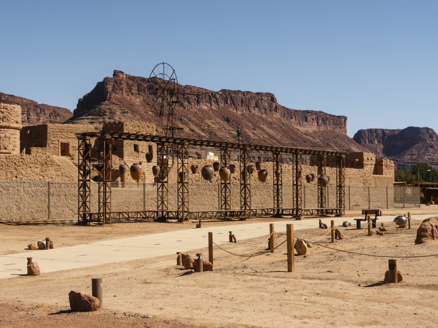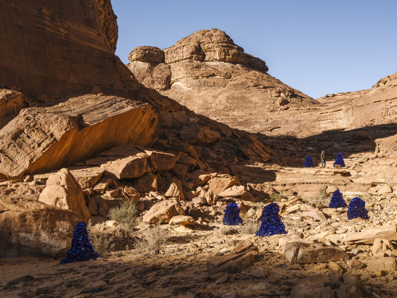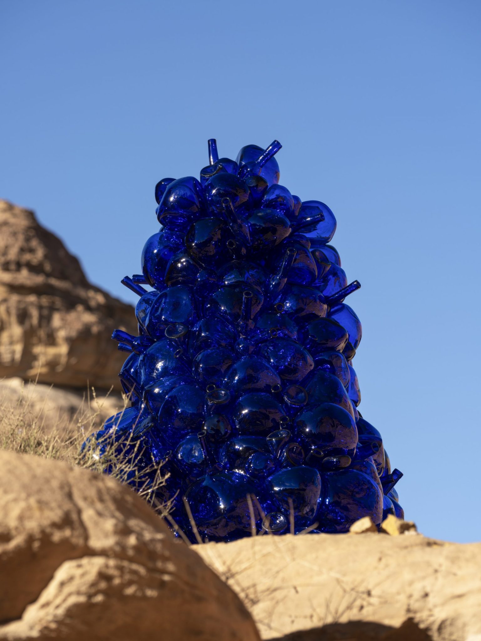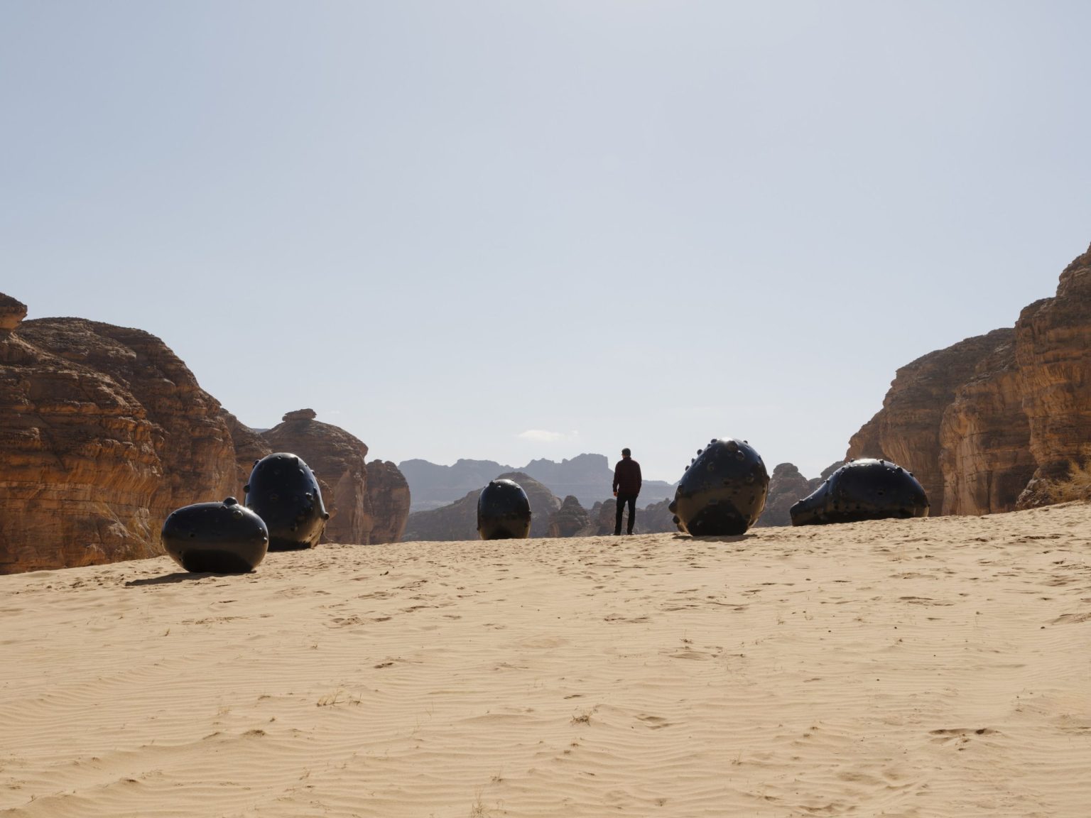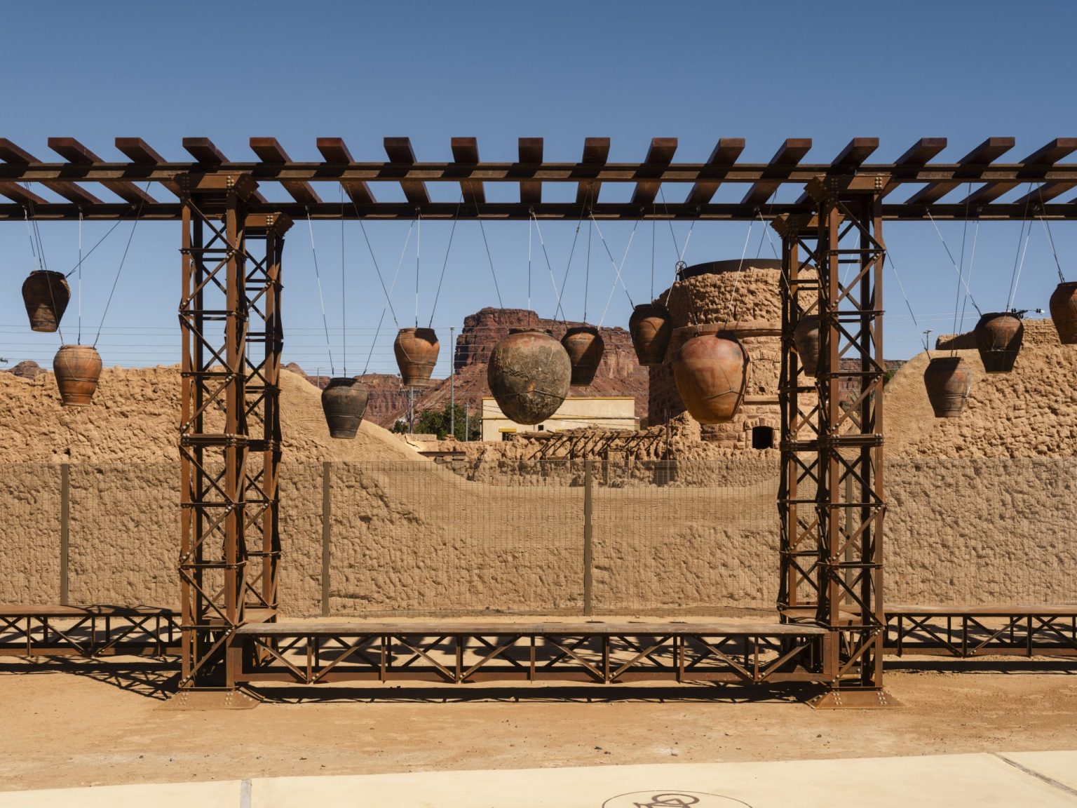 Also composed of vessels, Ibrahim Mahama’s terracotta pots are scattered across the landscape, suggesting new ecosystems emerging from the relics of history. Mahama’s works can be viewed across Desert X AlUla’s three sites including Dung Bara – The Rider Does No in Wadi AlFann, Hanging Garden at AlManshiyah Plaza and Gabli Din Pali – A Full Gourd Does Not Rattle; It Is Only a Partially Filled Gourd Which Rattles on Harrat Uwayrid.