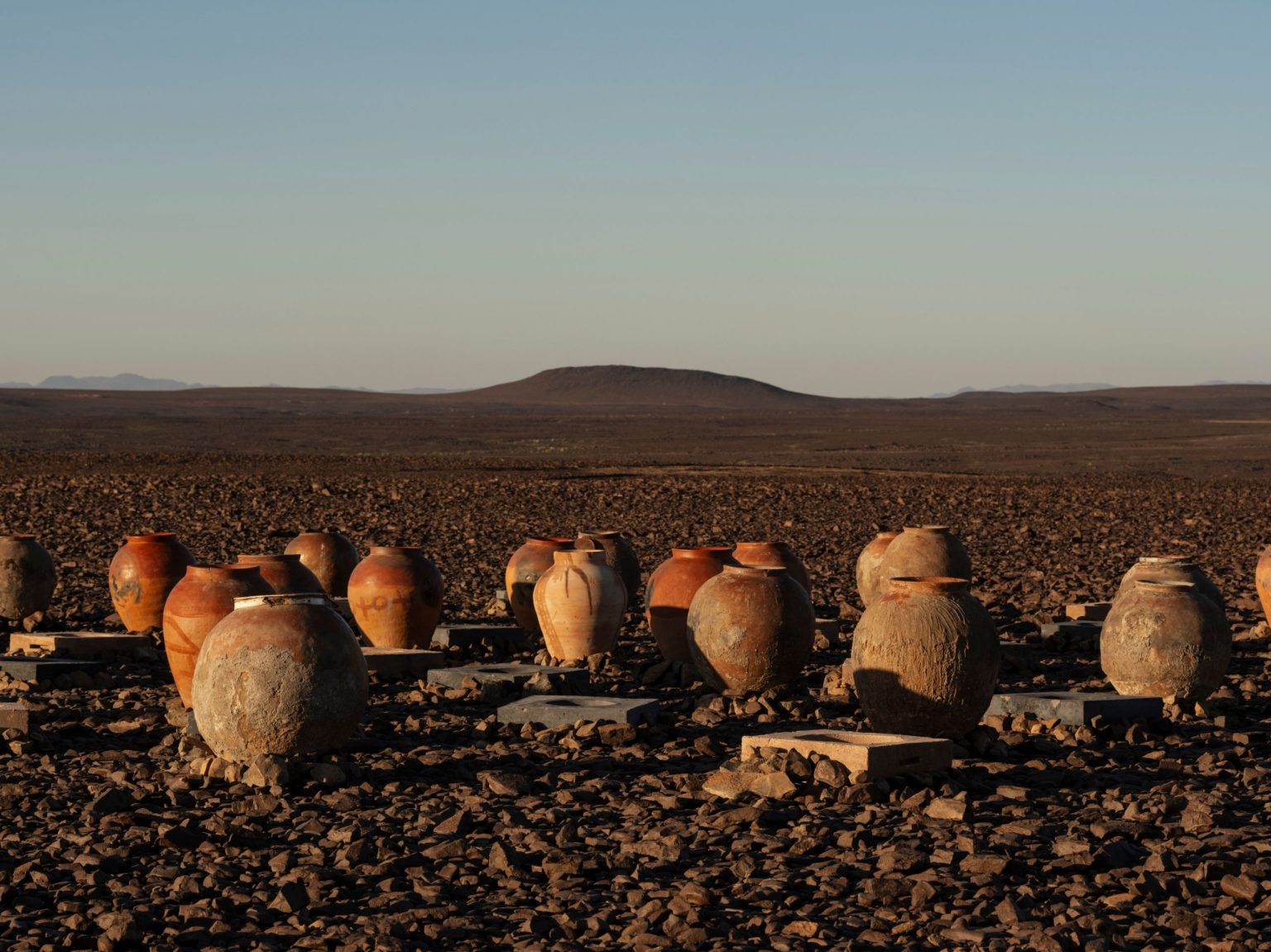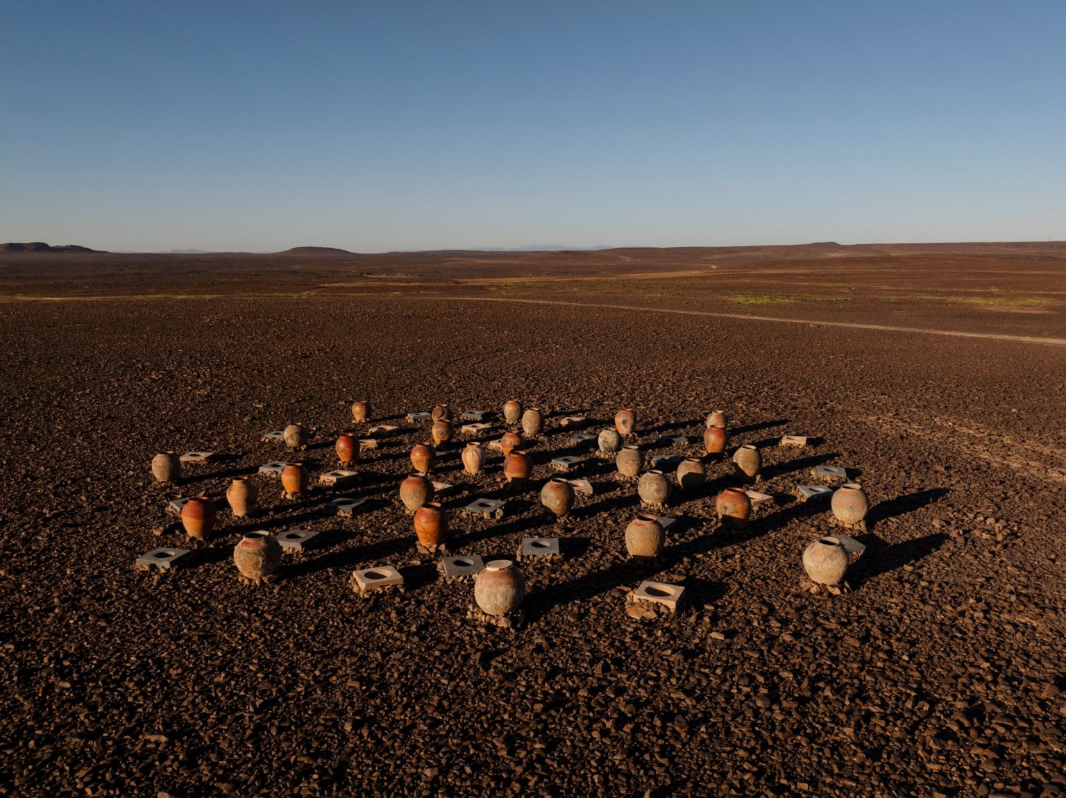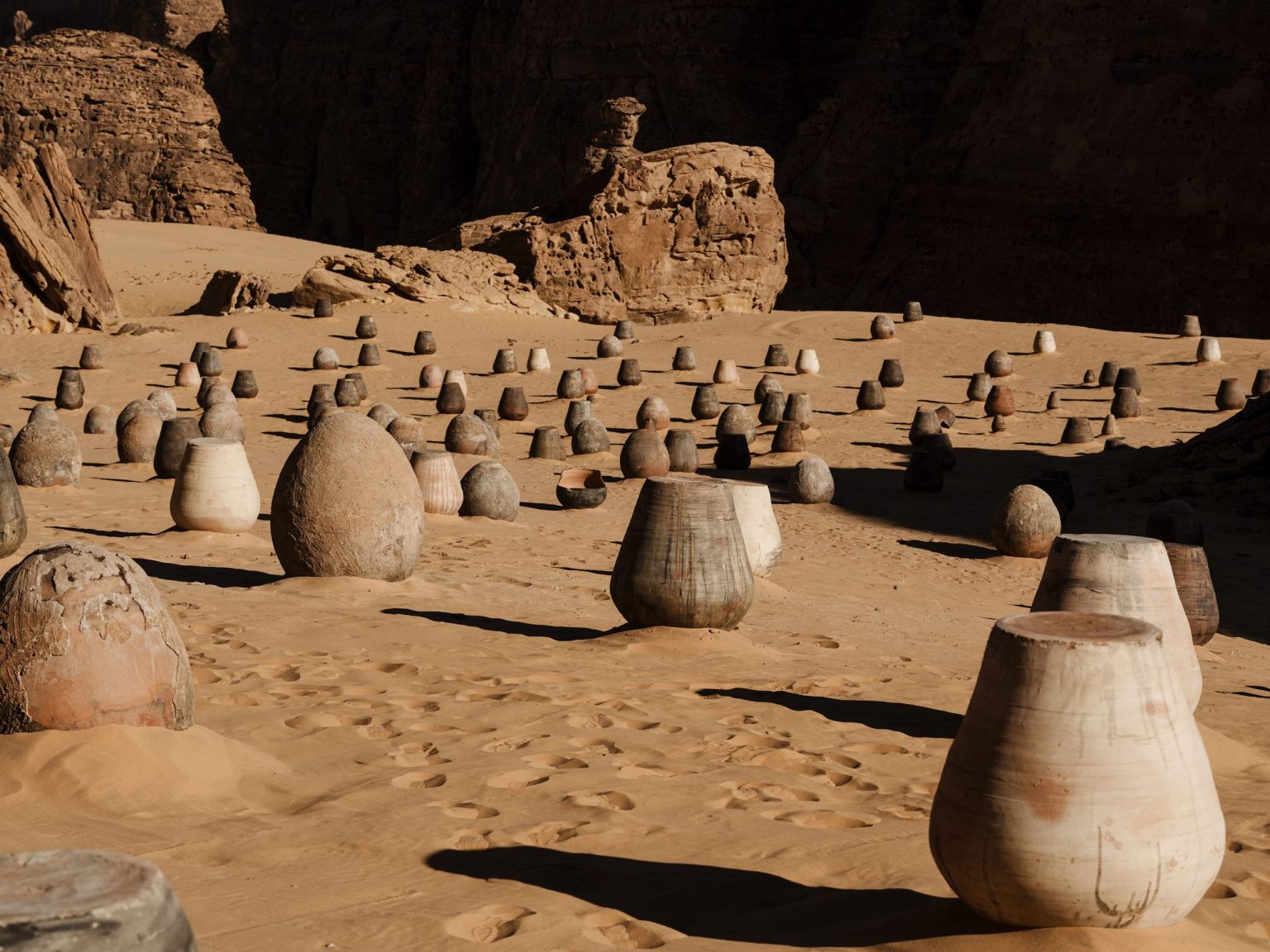 Ibrahim Mahama 的陶罐由容器组成,散落在景观中,暗示着从历史遗迹中诞生的新生态系统。该艺术家的作品在本次艺术展(Desert X AlUla)的三个地点都能欣赏到。