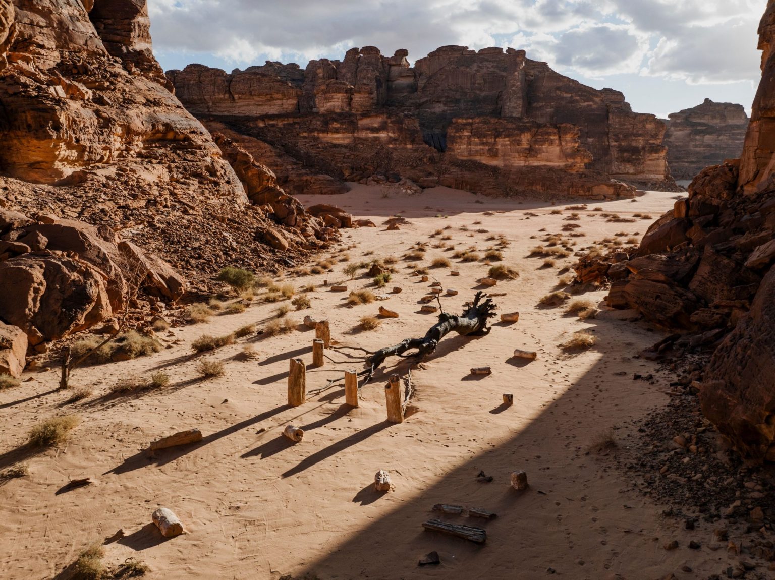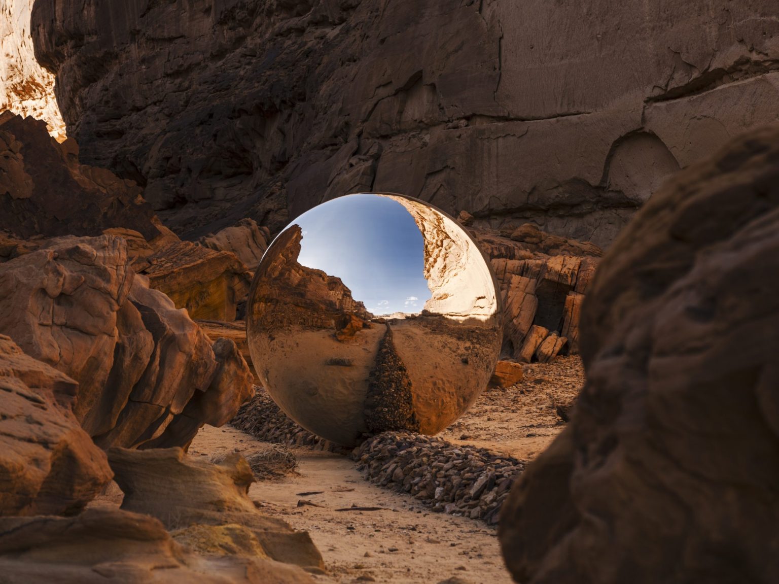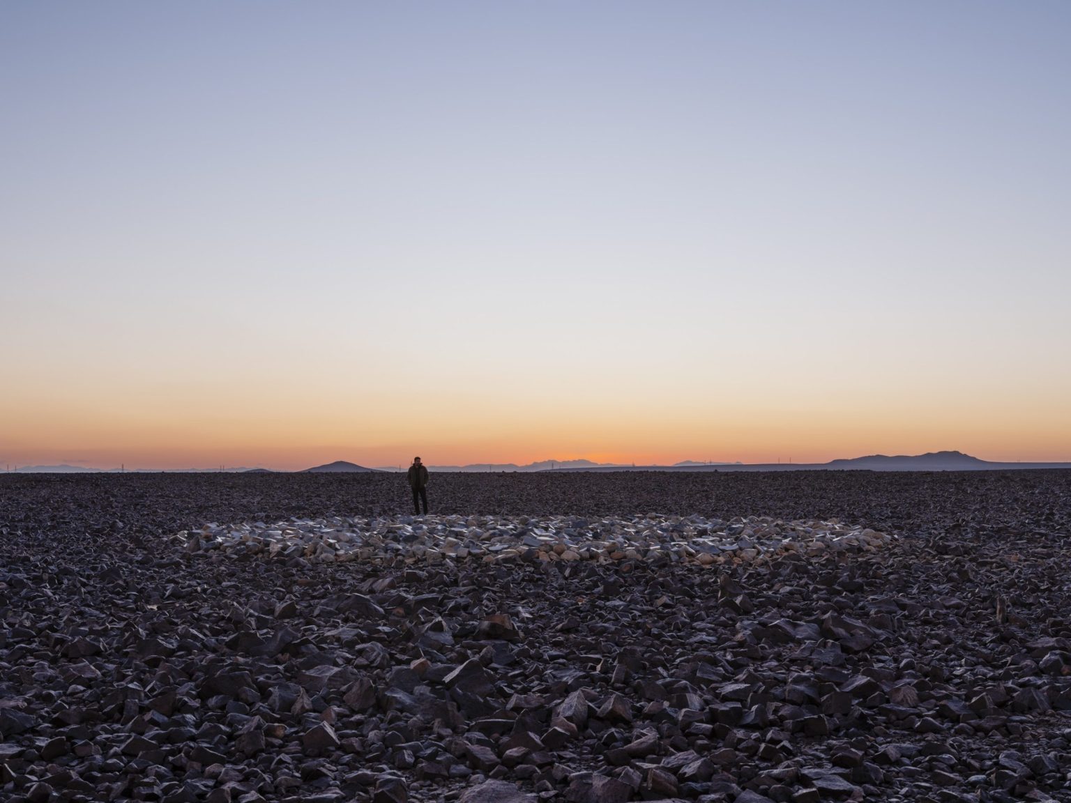 In The Dot, Faisal Samra shows how the Wadi AlFann valley originated from an ancient crack, revealing the small forces that shape grandeur over epochs. The illusion of time is symbolized by a line composed of rock fragments.