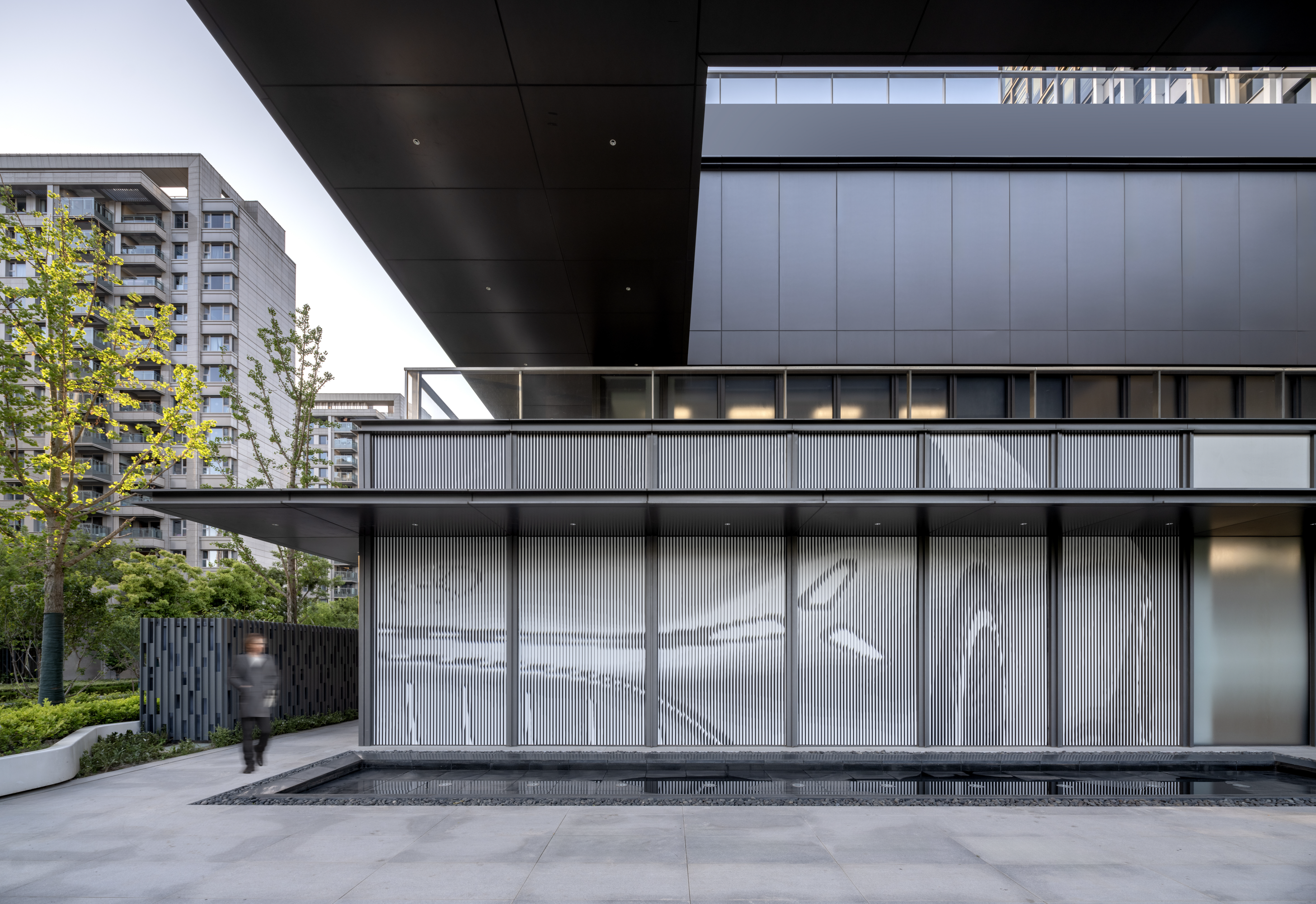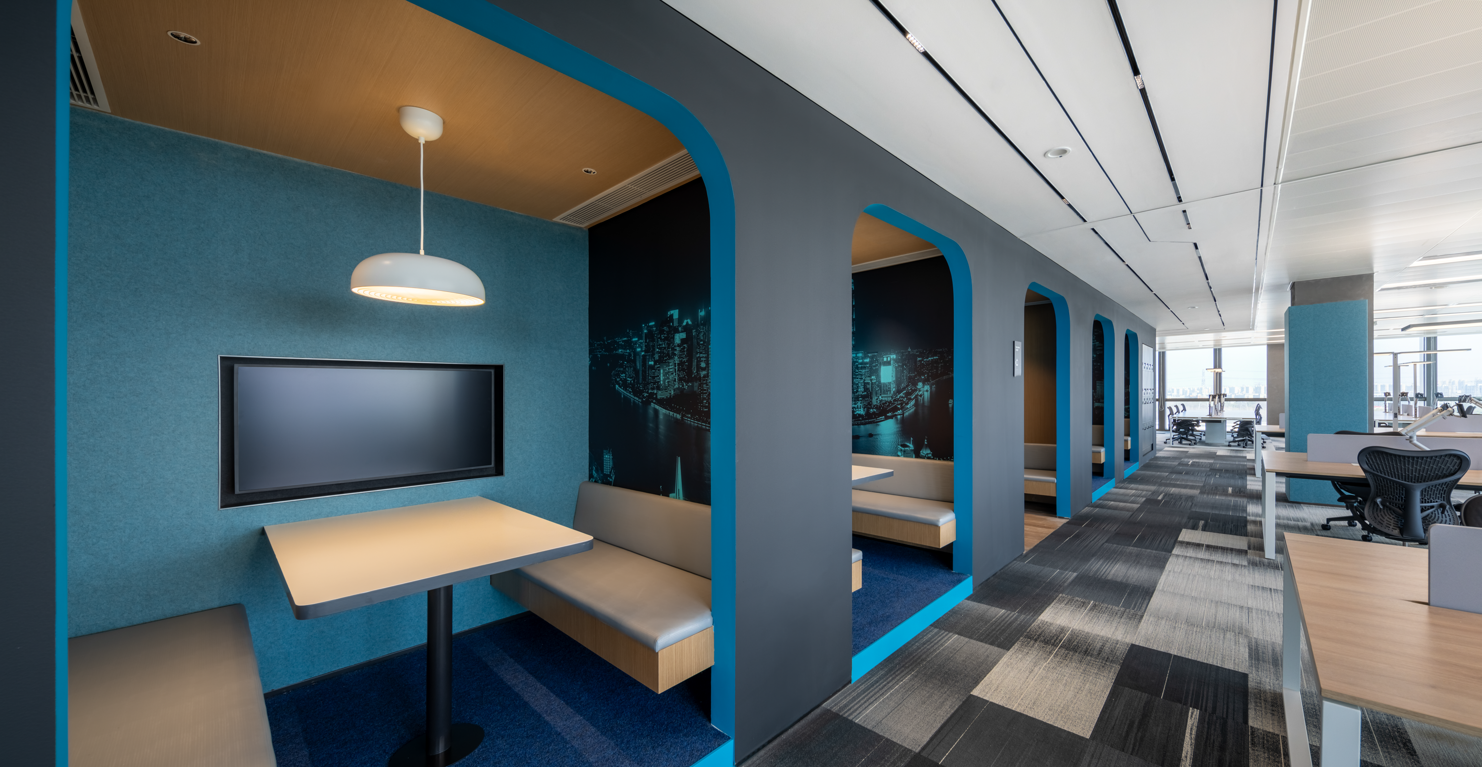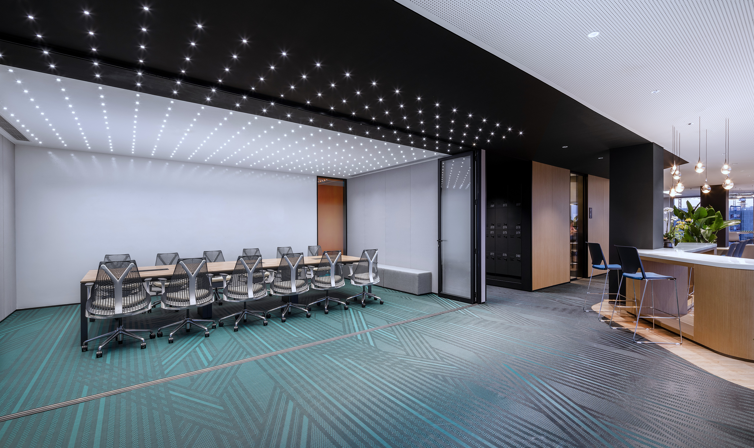 项目采用“数字河流”的设计理念,借鉴了上海历史悠久的水道和不断流动的数字信息之间,将其转化为诗意的平行,象征着物理和虚拟领域的连接。这个概念基础通过一系列的设计元素被赋予了新的生命延展性:地毯图案模仿了海滨和河流的聚汇,天花造型设计的灵感来自河流的节奏,让人漫步其中感受到到音乐作品的流动以渐强和停顿为标志。