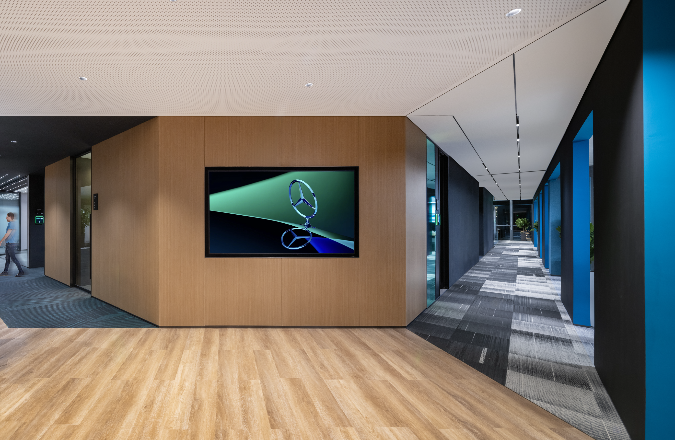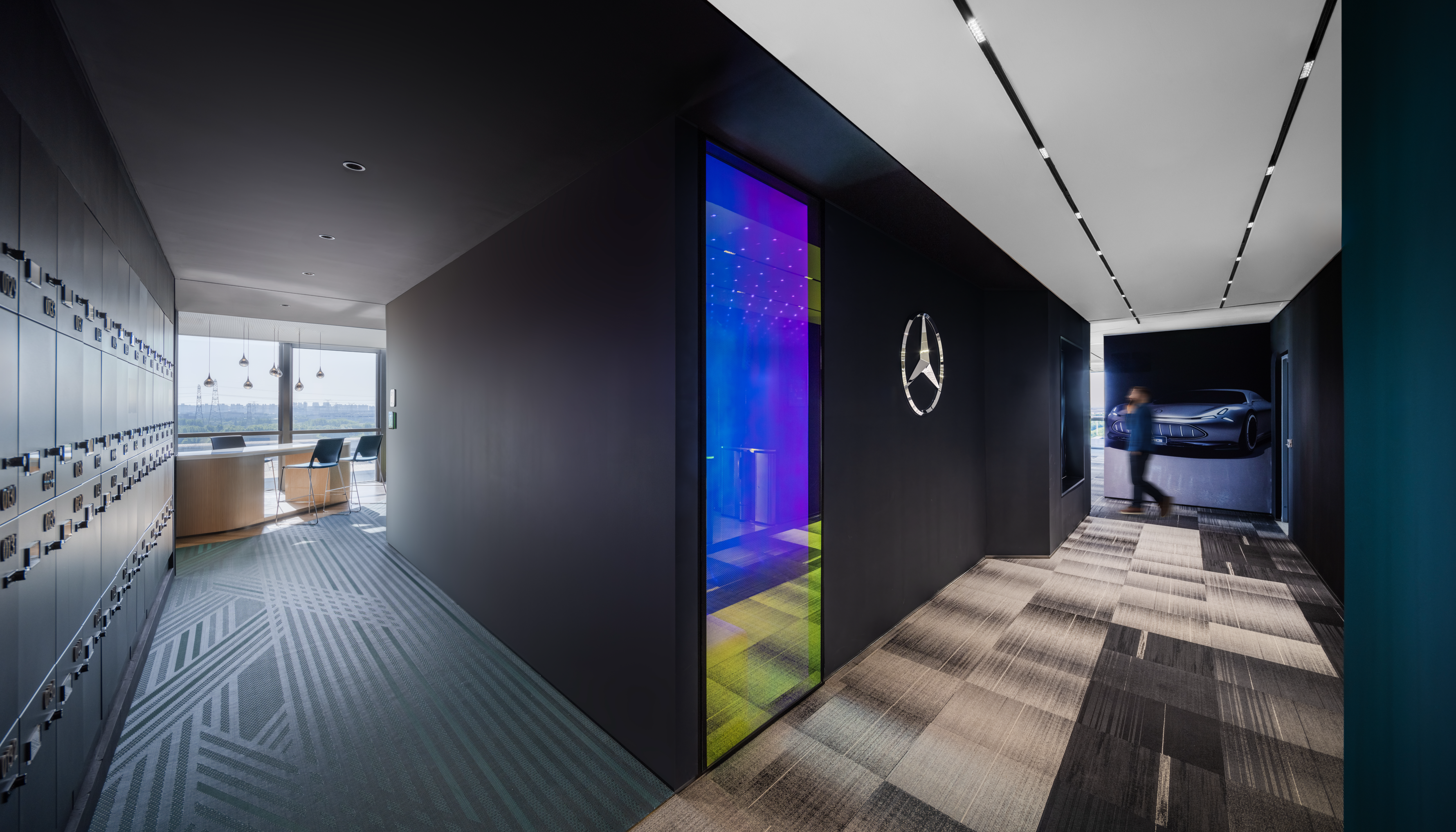 The automotive testing workshop covers an area of 2300 square meters and is divided into two floors, including the Advanced Driver Assistance Systems (ADAS) workshop, testing laboratory, software laboratory, and office space. In order to meet the specific needs of users, the center of the workshop is a huge two-story atrium decorated with graphics paying tribute to the iconic Mercedes Benz star logo, showcasing the latest concept cars. The design of this atrium is multifunctional and can be transformed into an activity space equipped with large LED screens, linking the crowd interaction on the first and second floor terraces.