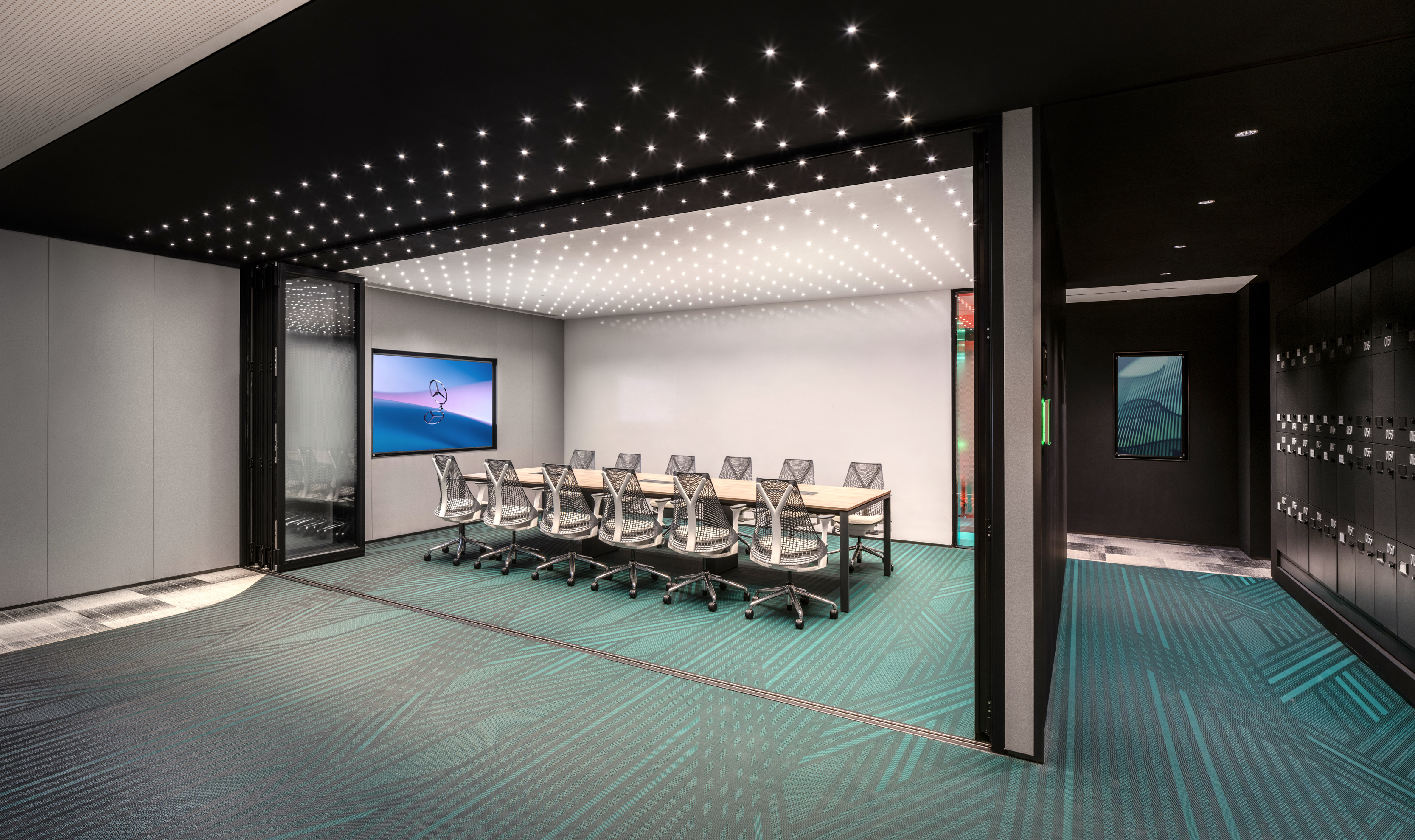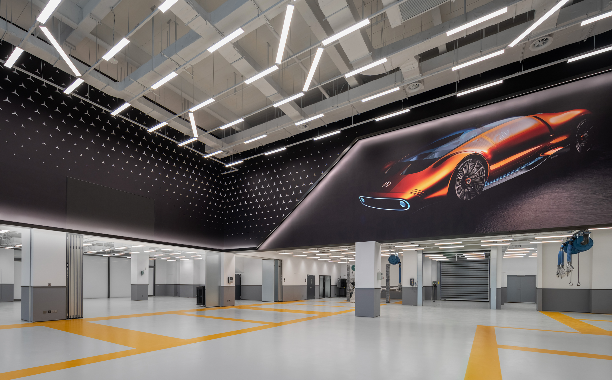 汽车测试车间占地2300平方米,分为两层,包括先进驾驶辅助系统(ADAS)车间、测试实验室、软件实验室和办公空间。为了满足用户的特定需求,车间的中心是一个巨大的两层中庭,装饰着向标志性的梅赛德斯一奔驰明星Logo致敬的图形,展示了最新的概念车。这个中庭的设计具有多功能性,可以转变为配备大型LED屏幕的活动空间,联动一楼和二楼露台的人群互动。