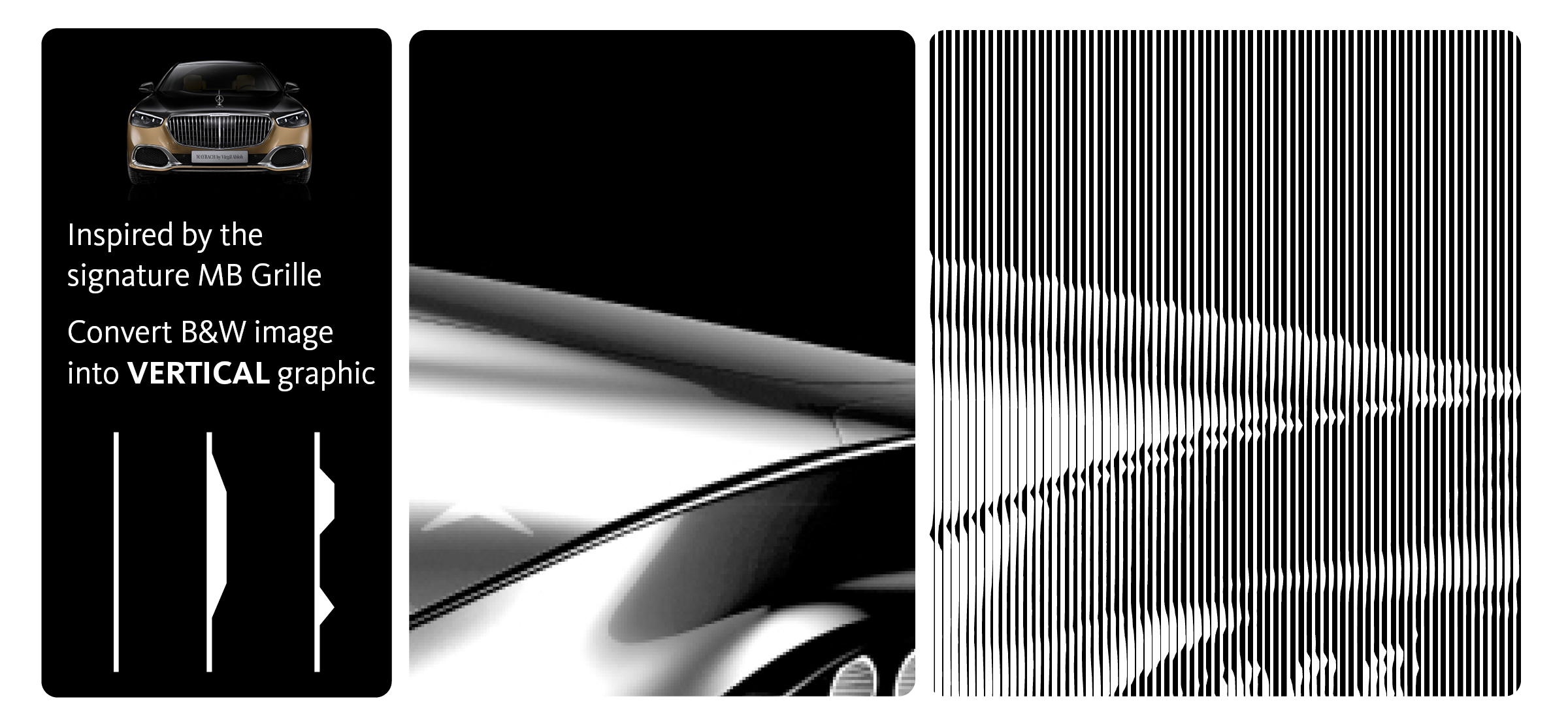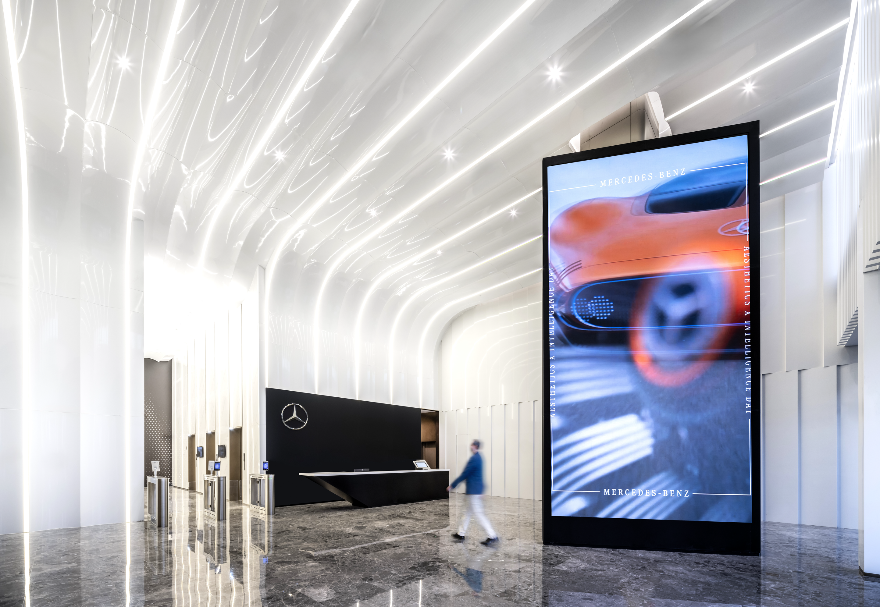 为了解决隐私和停电的需求,外墙采用了特别设计的薄膜。近距离看,图案显得抽象,但从远处看,它融入了一个独特的梅赛德斯概念车的形象,扩大了车间的视觉冲击力。