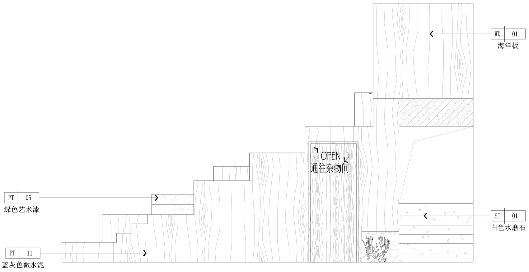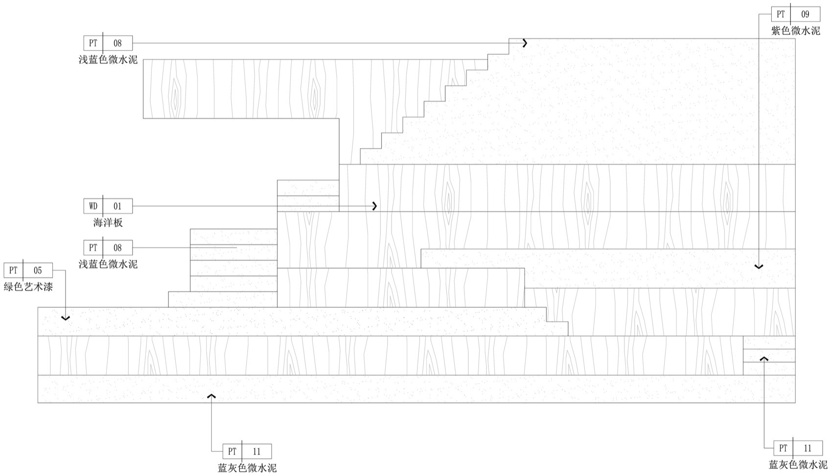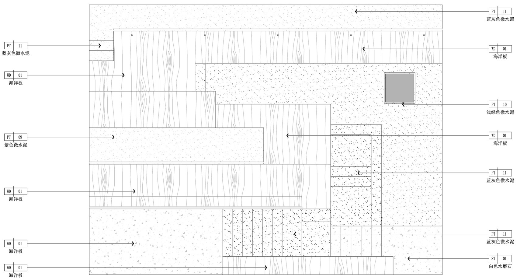 材料:无机水磨石、硅藻泥、金属板、海洋板