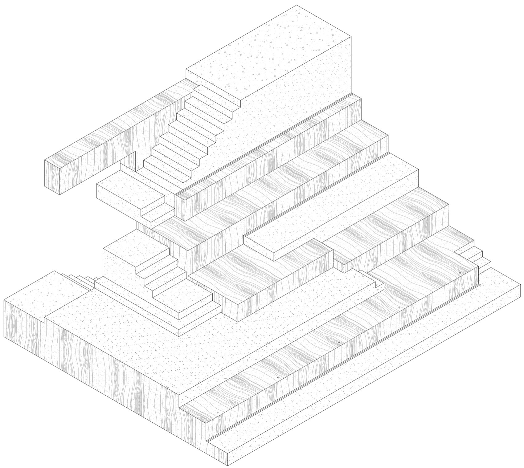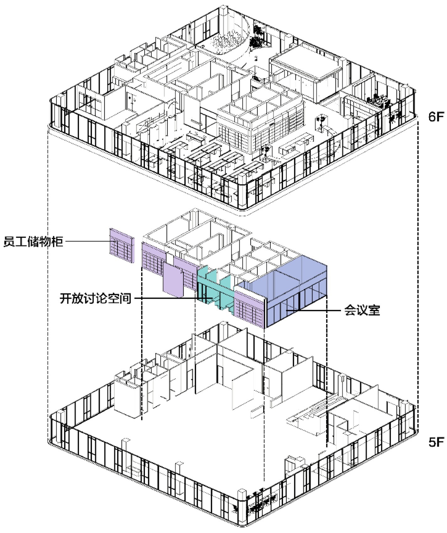 进入办公楼最先引人瞩目的是五楼和六楼连接的开放(会议室)大阶梯,大阶梯每个体块各异,我们设计之初就将他们分为abc三种类型的体块安插在大阶梯群中,目的是为了其承载更多功能,不仅可以容纳30-40人开会,也可以成为员工们临时讨论工作亦或是休闲,看书,聚会的场所