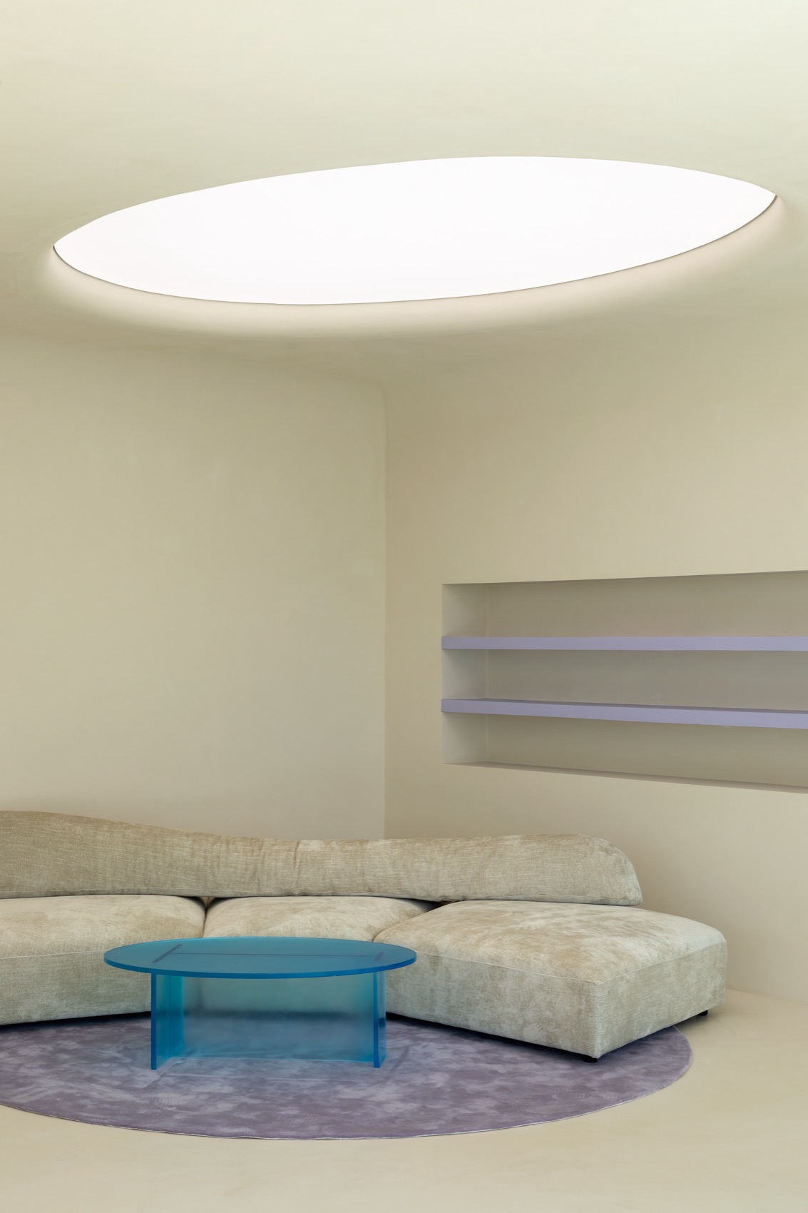 从风格上,我们也明确了“奶油苏打”的色彩概念,虽然品牌是母婴产品,但也是成年人工作的地方,所以我们运用了小时候喜欢的奶油蛋糕的色彩和线条,但也运用了比如不锈钢板和局部硬朗的线条来中和整个空间的柔软度,使整个空间温度又不失利落。