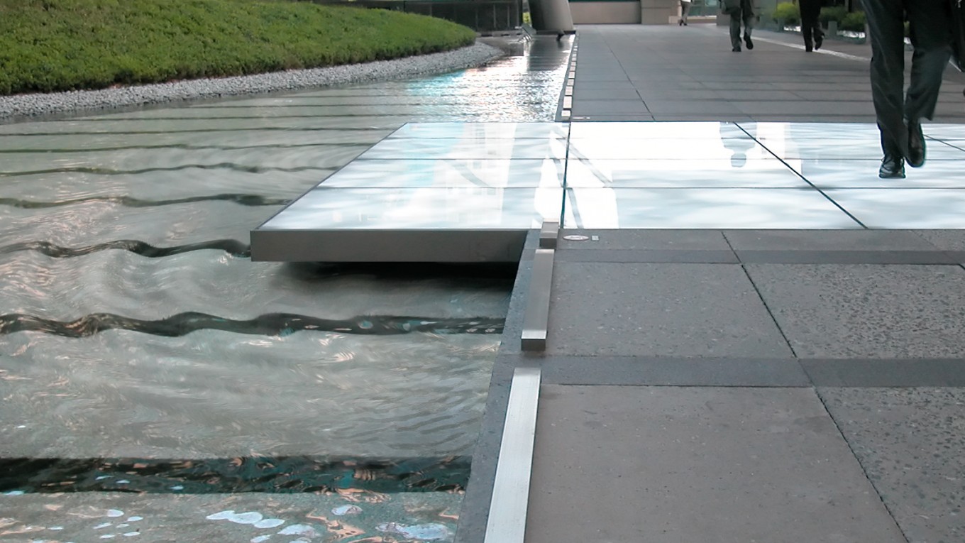 Duality is a public art installation created for an office space in central Tokyo. The installation is integrated into a covered walkway that connects the metro station with adjacent residential and office buildings. It is a transit site surrounded by a large water basin, an artificial pond. This specific spatial situation provided a springboard for the concept. Virtual light waves on the sidewalk and real waves in the water amplify the interaction of "solid" (path) and "liquid" (water).