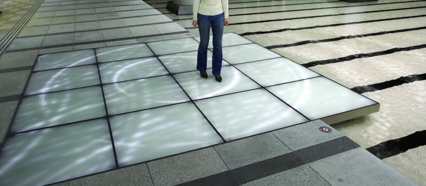 The white monochrome LED panels are installed on the walkway, measure 4 x 4 meters and are covered with sandblasted opalescent glass. Load cells beneath the glass blocks measure the position and force of each footstep, which triggers a corresponding virtual ripple on the LED panel. When these ripples of light hit the edge of the pond, mechanical actuators seamlessly forward these patterns into physical waves in the water.