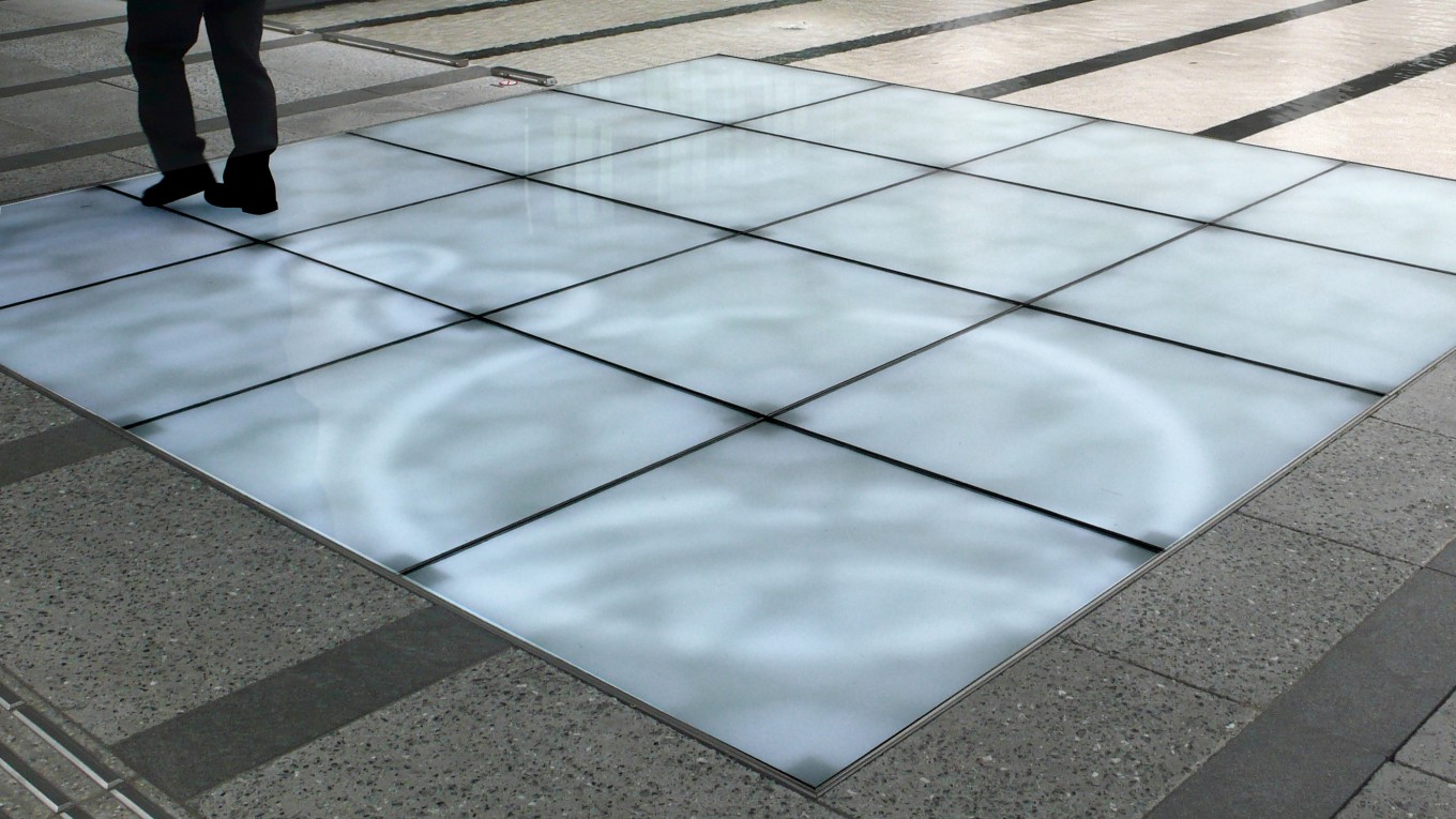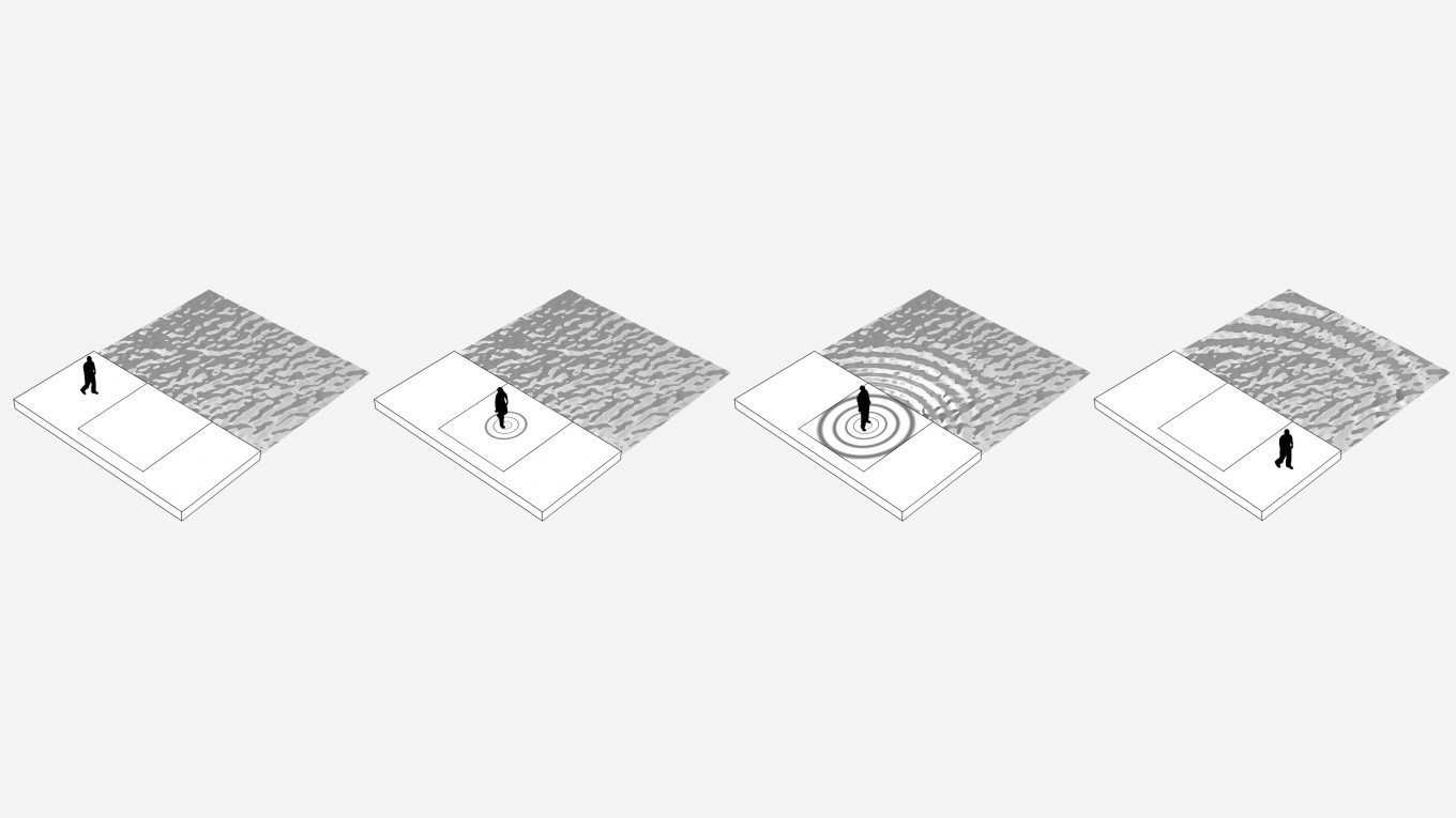白色单色 LED 面板安装在人行道上,面积为 4 x 4 米,并覆盖有喷砂乳白色玻璃。玻璃砖下方的称重传感器测量每个脚步的位置和力量,从而在 LED 面板上触发相应的虚拟波纹。当这些光的波纹撞击到池塘边缘时,机械执行器将这些图案无缝地转发为水中的物理波。